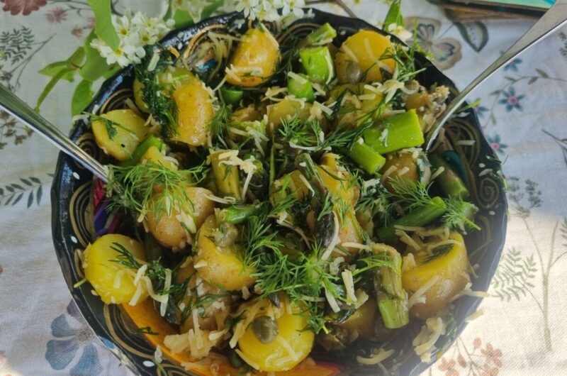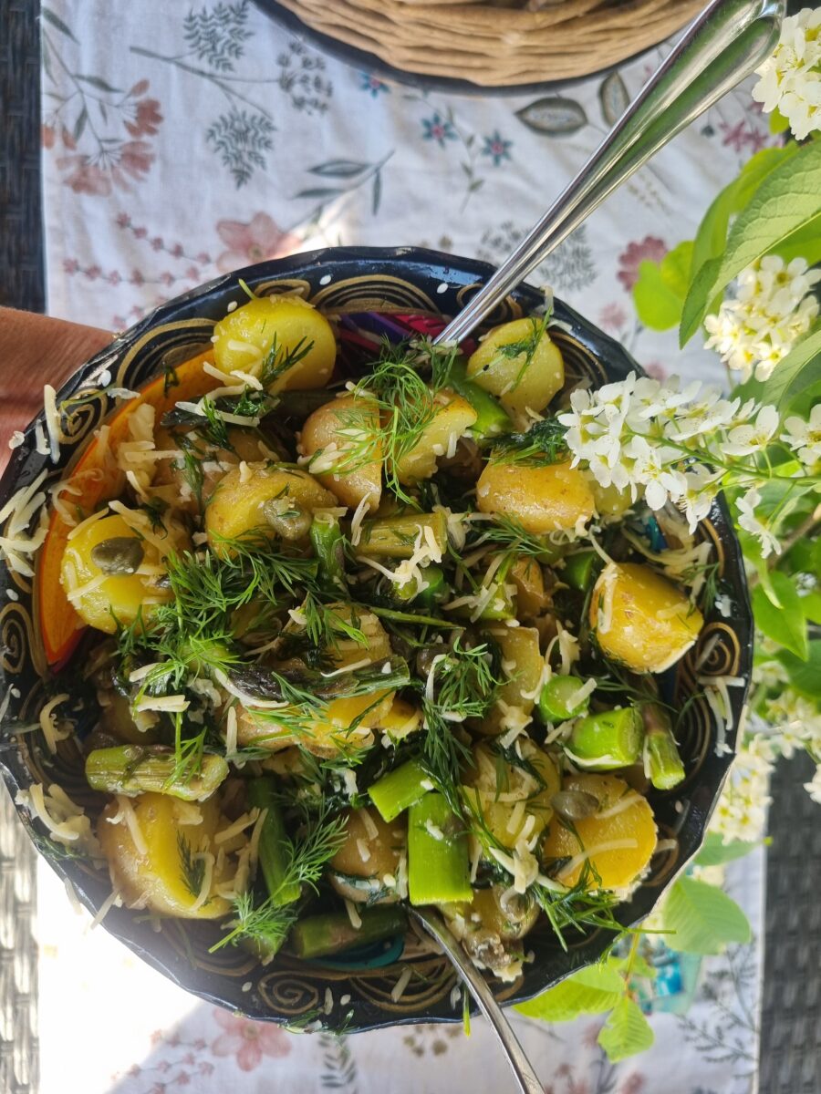 - Nyt og kos deg med denne kjempegode potetsalaten. Godt til alt av grillmat, særlig god til laks og passer godt på koldtbordet.