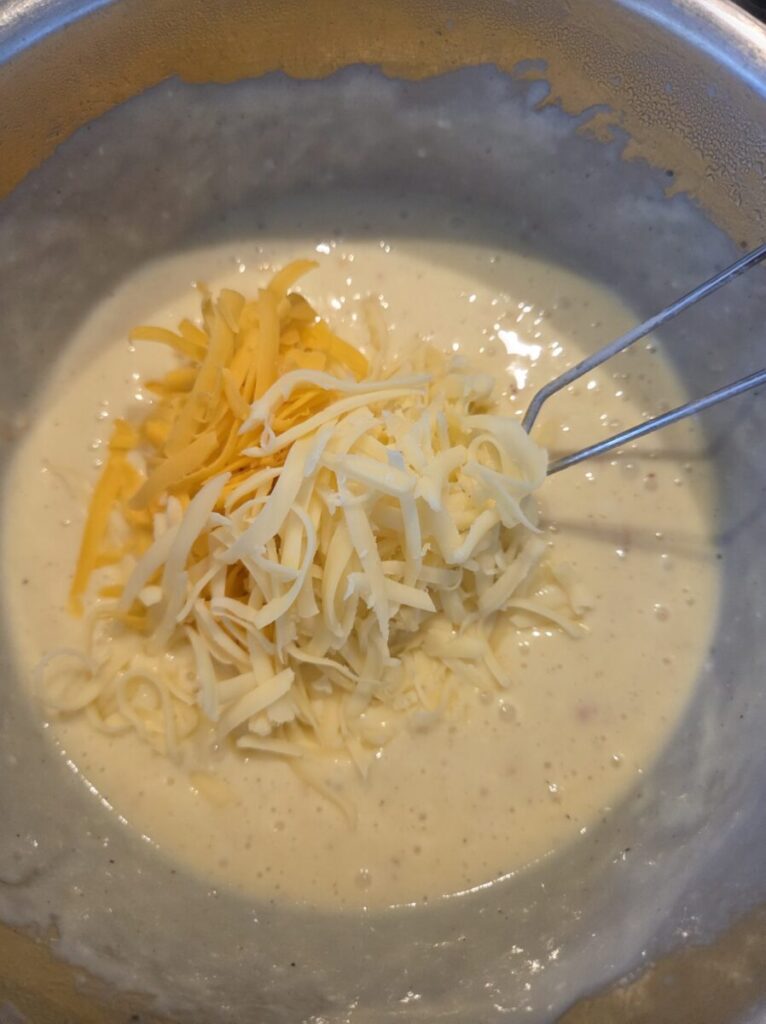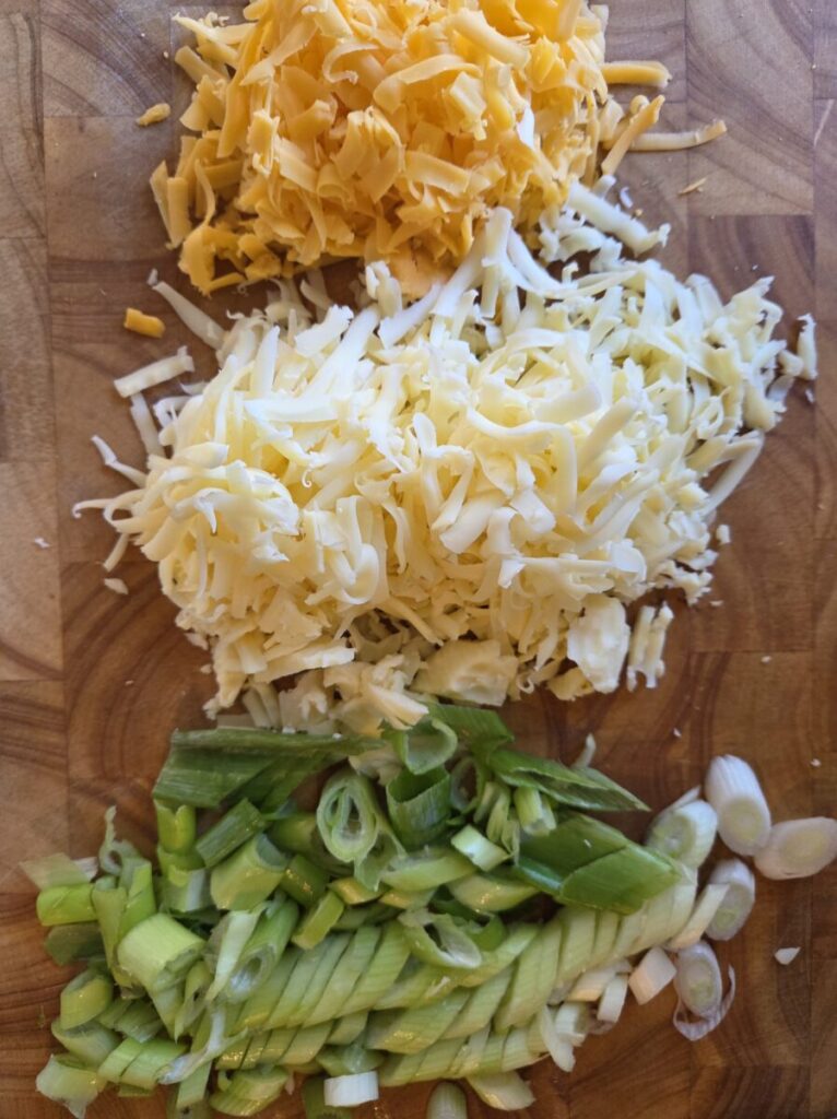- ca 200 gram revet ost (spar litt til topping) Jeg brukte både cheddar og gulost, bruk det du har