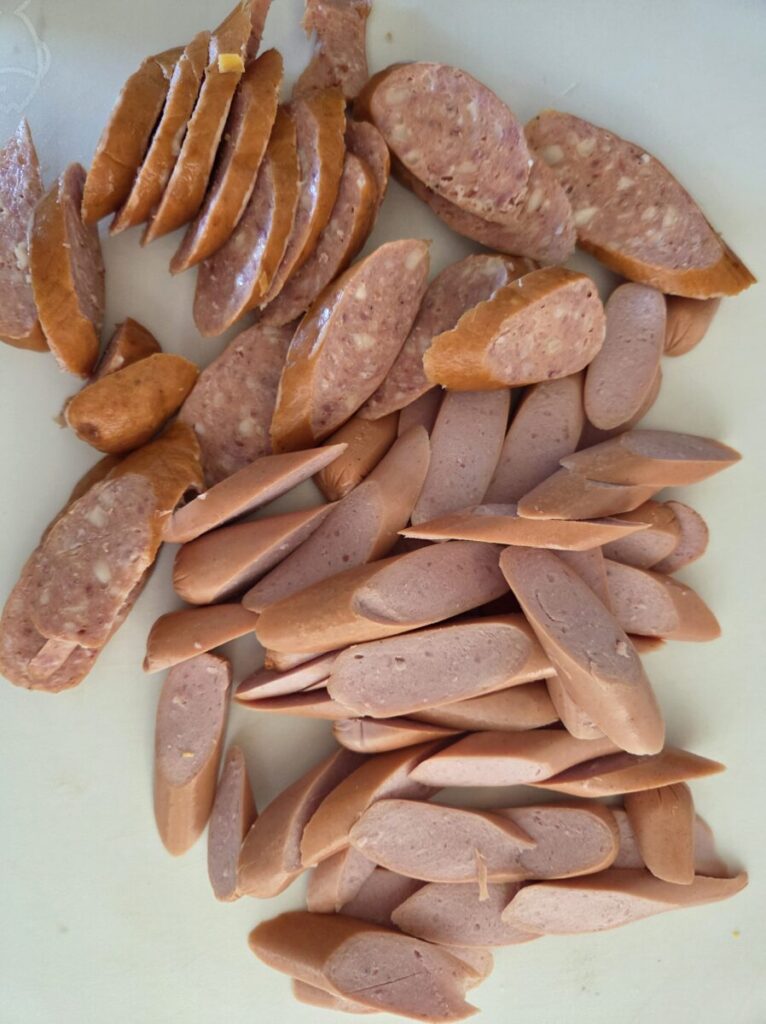 Start med å koke makaronien som anvist på pakken. Skjær pølsene i biter, kut vårløken og riv osten.