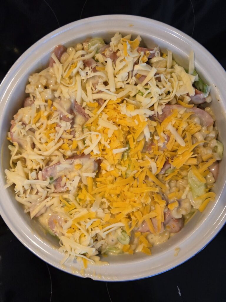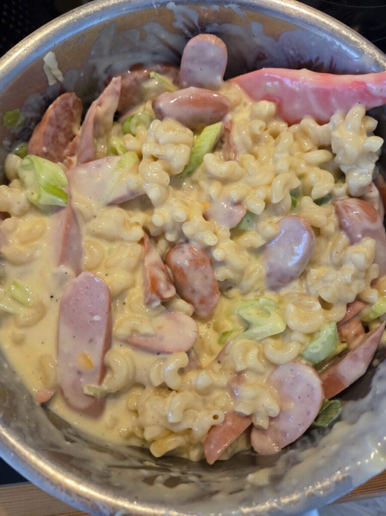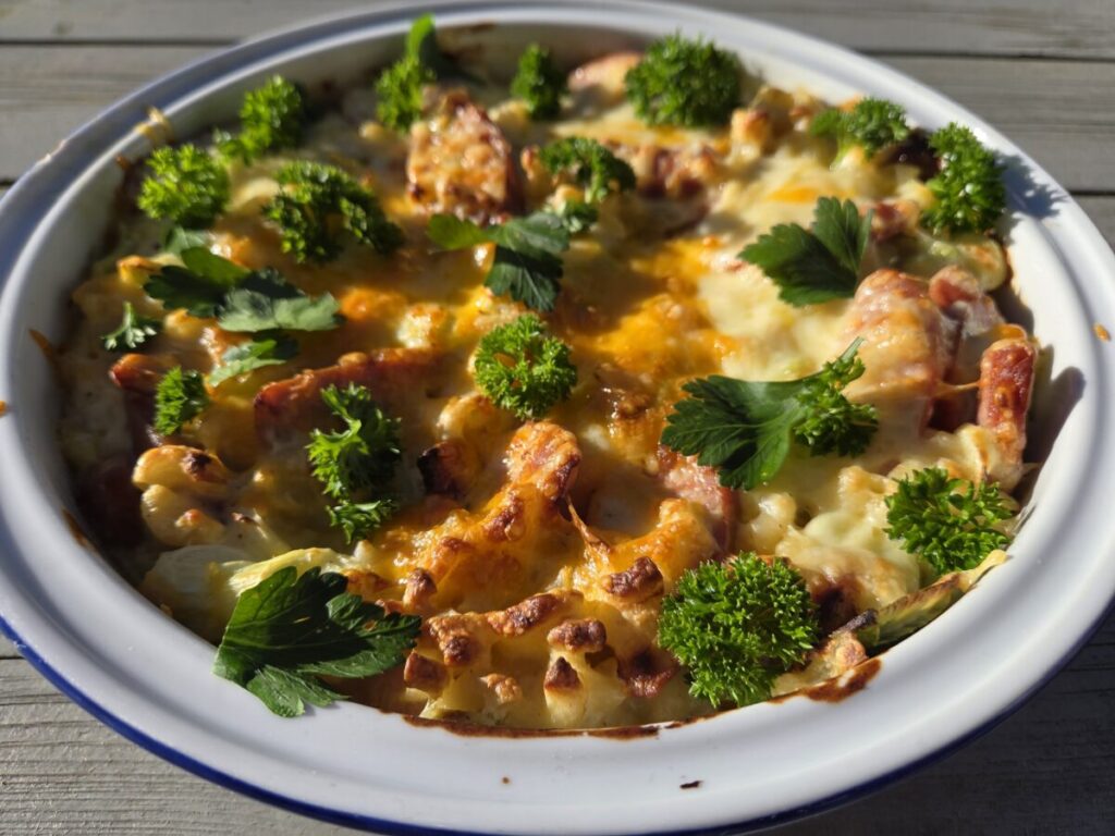 En gratinert makaroniform med hvit ostesaus og pølser er noe alle liker. En god hverdagsmiddag for store og små. 🙂