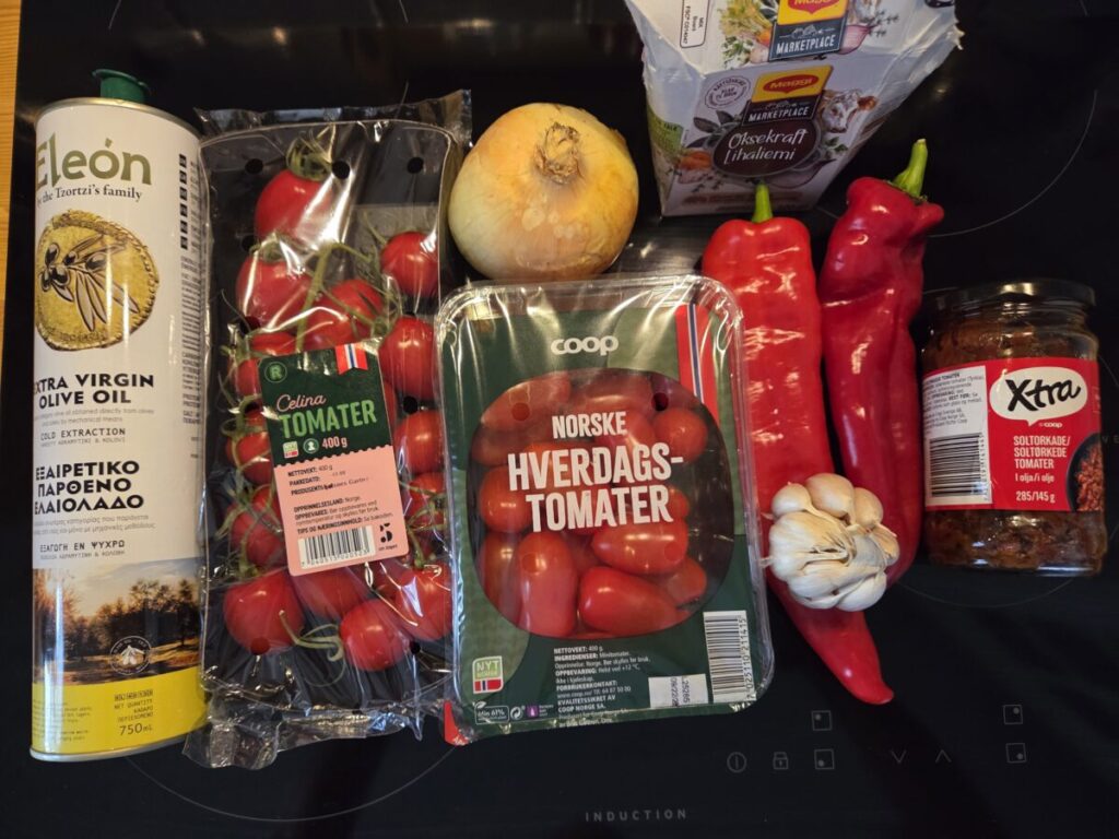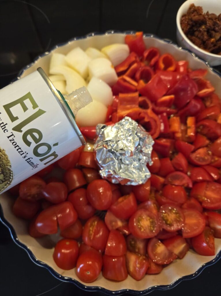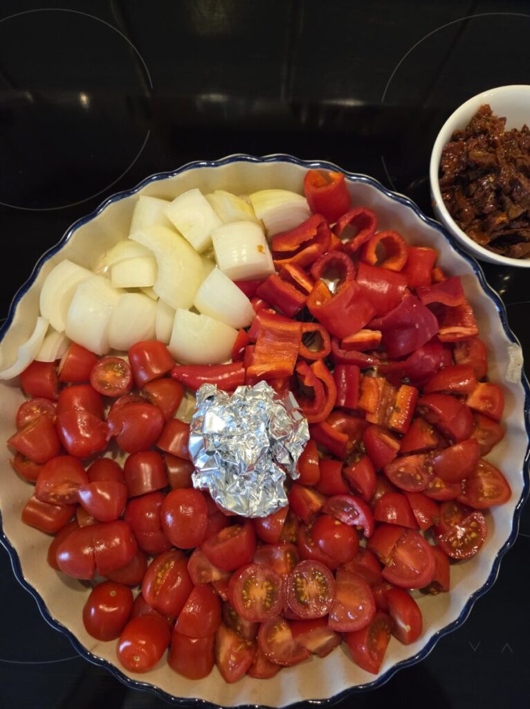 Del tomatene i 2 eller 4, alt ettersom hvordan størrelse de har. Kutt løken i to, så del i 6 biter igjen. Spiss paprikaen deles i grove biter. Pakk inn hvitløken i folie. (skjær gjerne av toppen først)Legg alt i en ildfast form. Ringe over olivenolje og stek i ovnen 30-35 min.