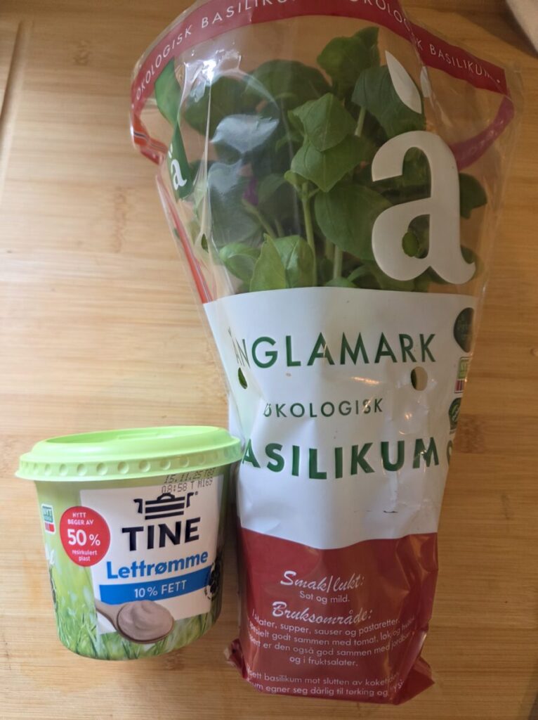 Da er det bare å servere med en rømmeklatt i og deilig fersk basilikum og evt nystekt brød til.