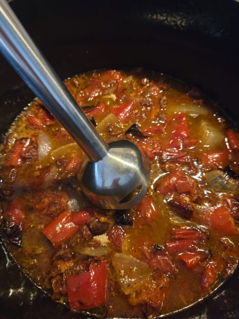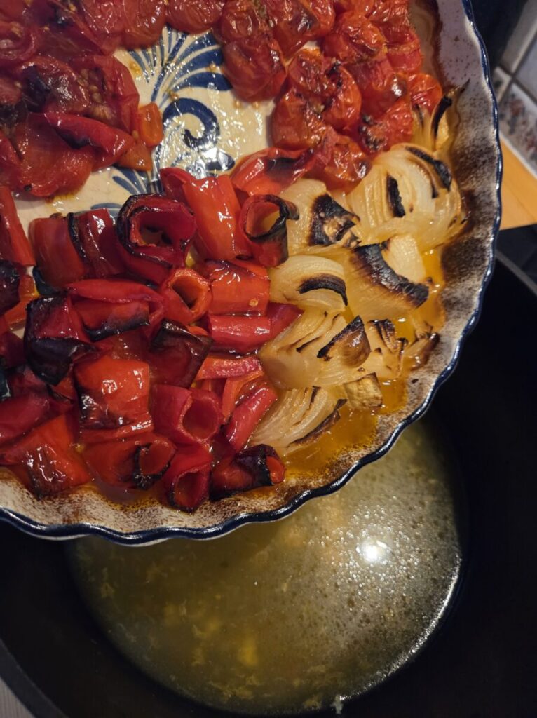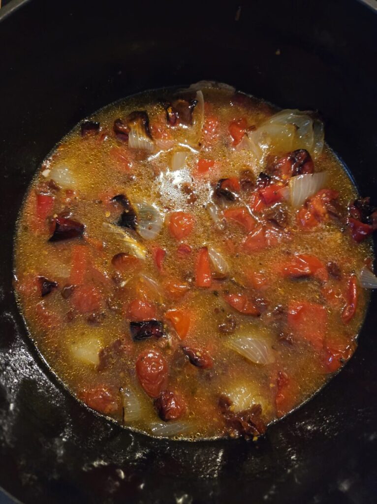 Når alt er ferdig bakt i ovnen skviser du ut den bakte hvitløken i kraften samtidig så tilsetter du alle grønnsaker også i kraften og tilsett de soltørkede tomatene. Kok opp og la småkoke 10-12 min.
