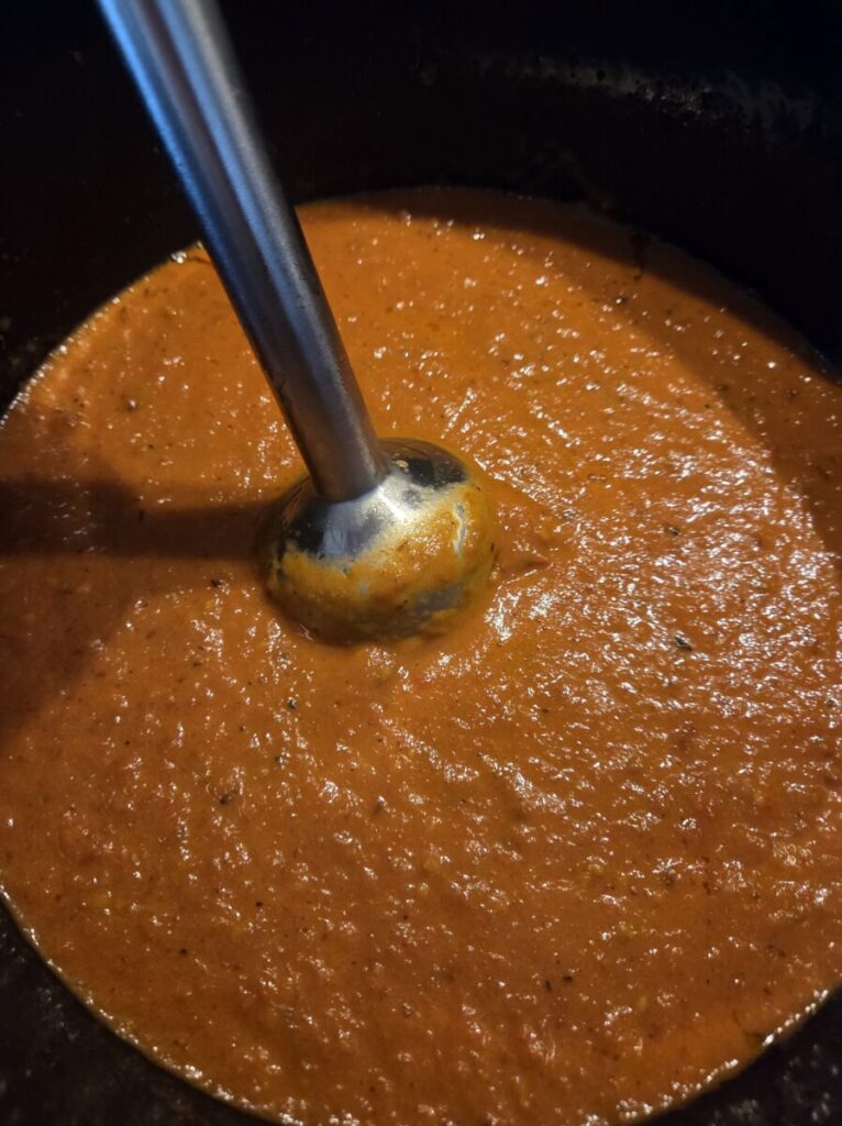 Når den har småkokt ferdig, tilsett nykvernet pepper og evt salt hvis det trengs. Smak til. Bruk en stavmikser og kjør suppen til bitene er oppløst. (30 sek ca)