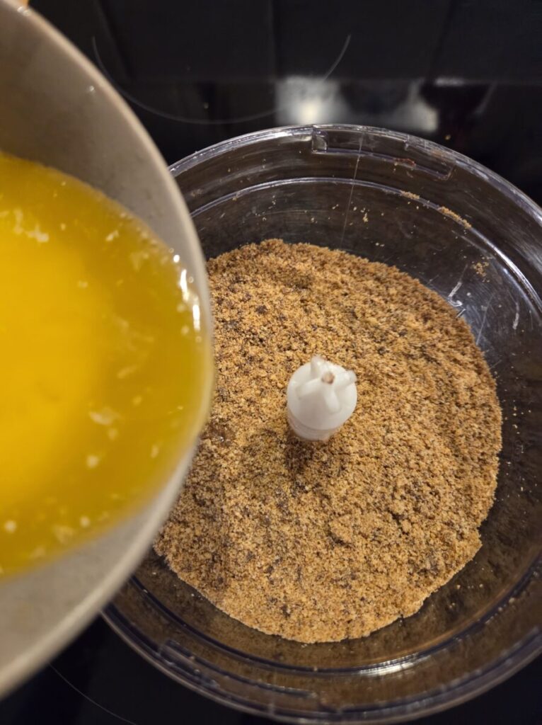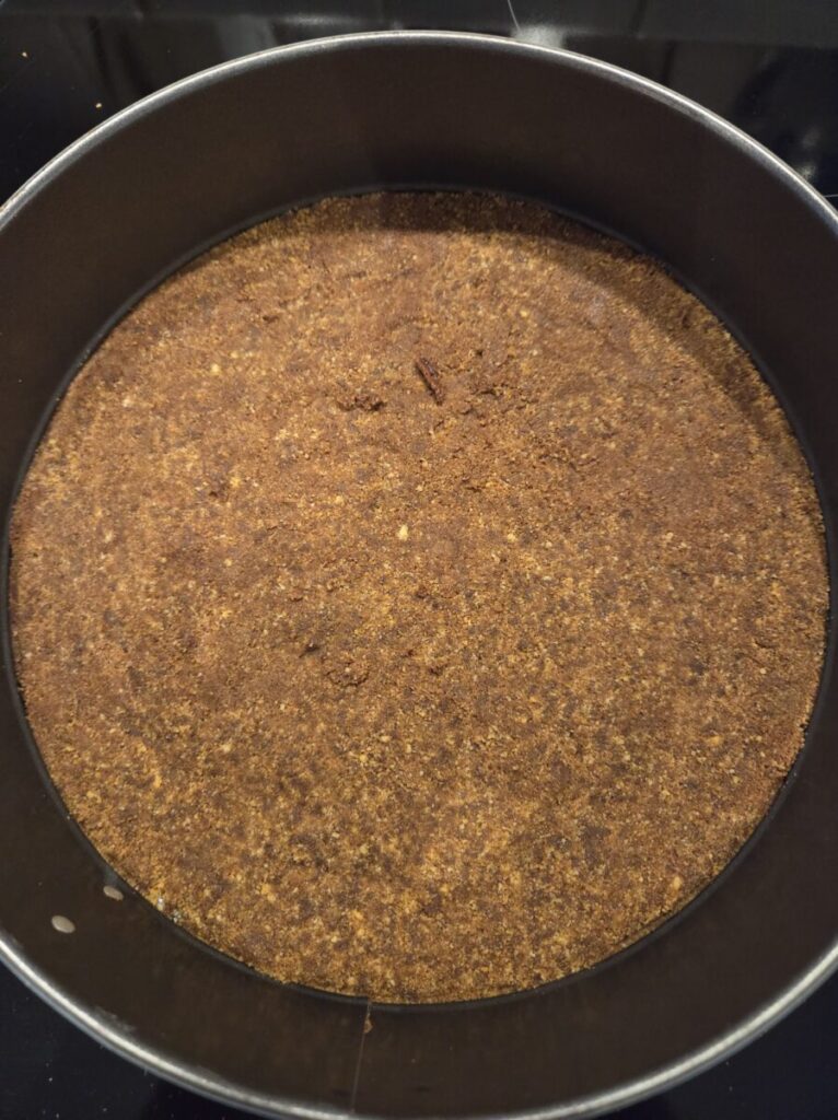 Knus kjeksen i en pose eller gjør som meg, putt alt i en liten blender. Smelt smøret. Bland i det smeltede smøret i kjeksen og trykk ned alt i en liten kakeform. Sett kaldt mens du lager trøffelen.
