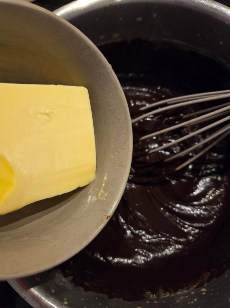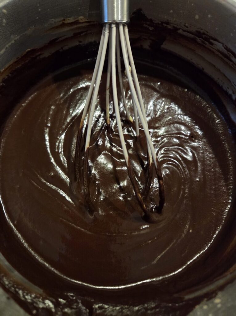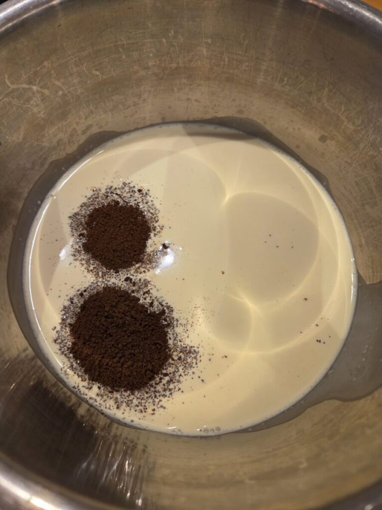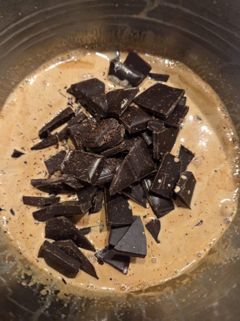 Kok opp fløten med kaffepulveret i. Når det koker tar du kjelen av platen og setter til side. Knekk opp sjokoladen og ha i fløten, rør godt med en visp så alt smelter.