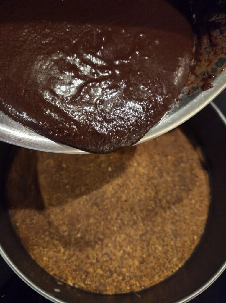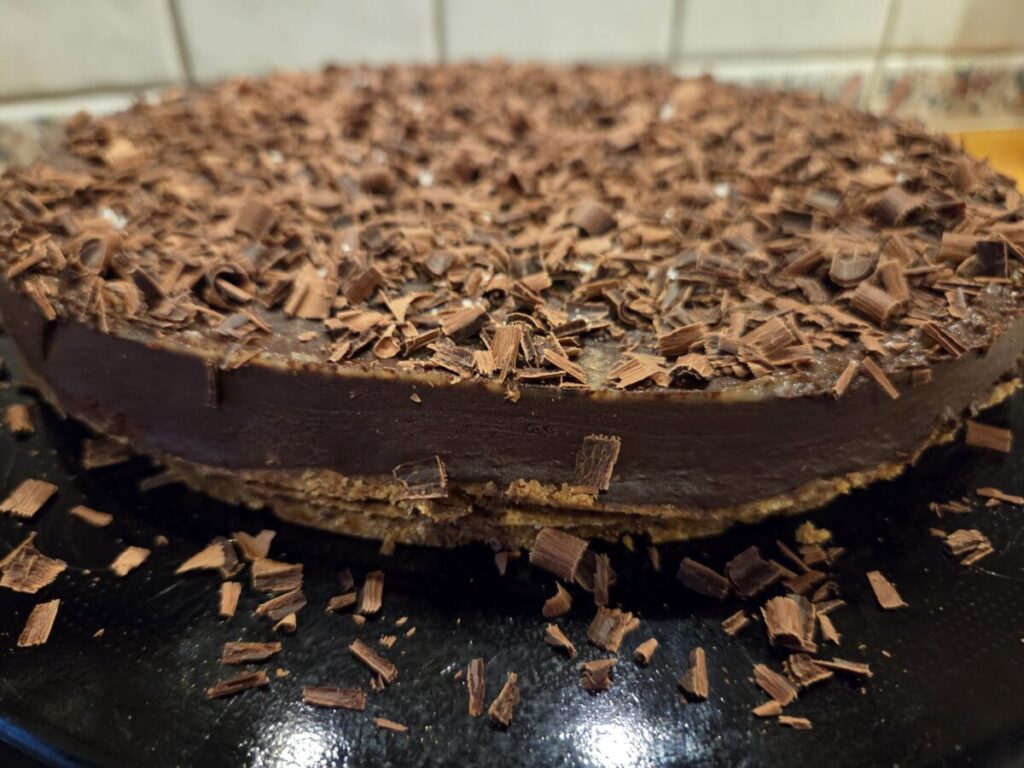 Hell sjokoladetrøffel fyllet over kjeksbunnen, pynt med feks revet sjokolade og la stå kaldt i 2 timer.
