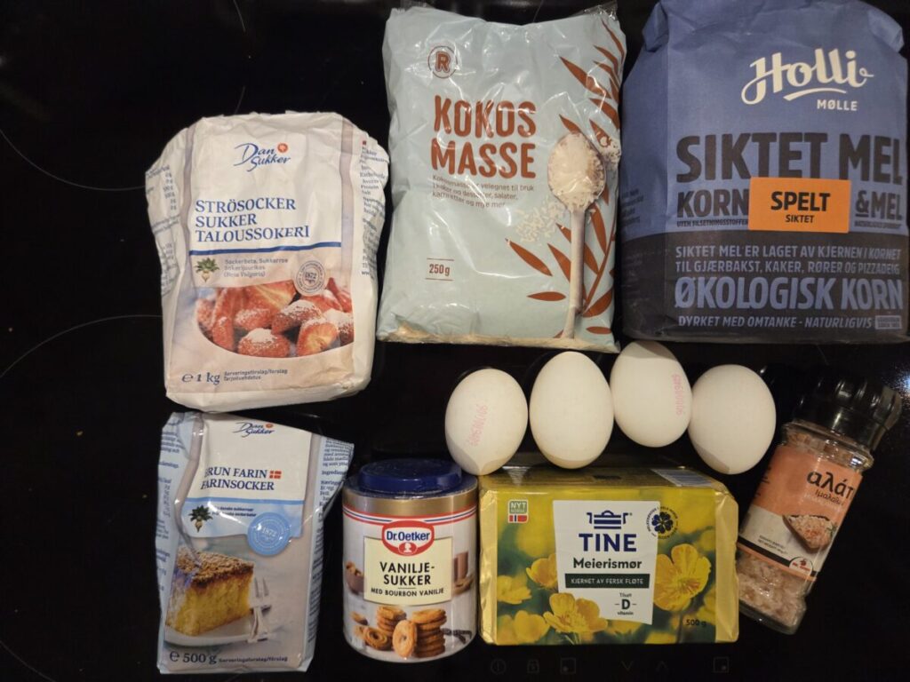 Jeg liker å bake en langpanne kake som jeg kan fryse og ta opp når det trengs. Og denne er jo fin å fryse. 🙂 Siden det er kokos som dominerer denne kaken så passer den fint i julen synes jeg. Ikke er den komplisert heller, du smekker røren sammen på under 10 minutter også er det rett i ovnen. Lettvinte kaker er fint. 🙂