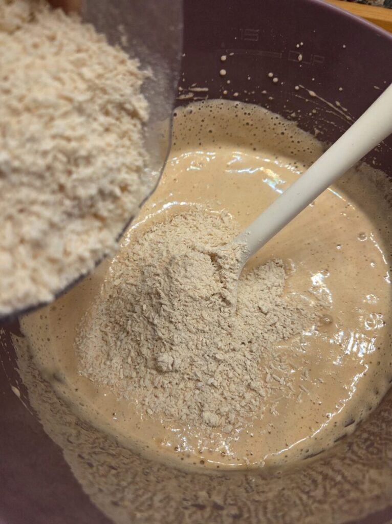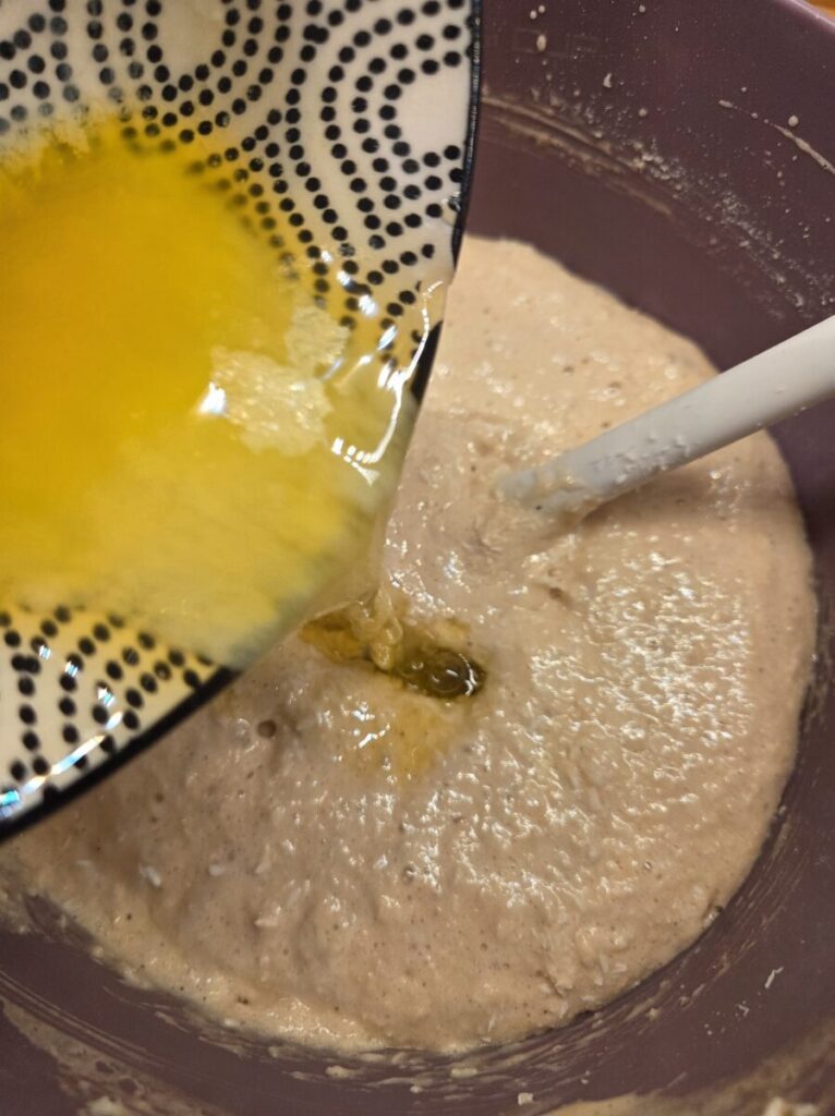 Bland kokos, hvetemel og salt i en bolle og tilsett i røren og vend inn med en slikkepott. Tilsett smøret tilslutt.
