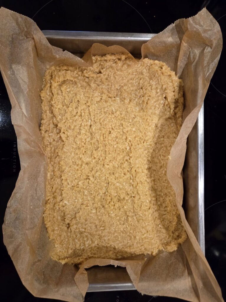 Dekk en liten langpanne med bakepapir og hell røren i. Stek i ca 25 minutter og avkjøl på rist.