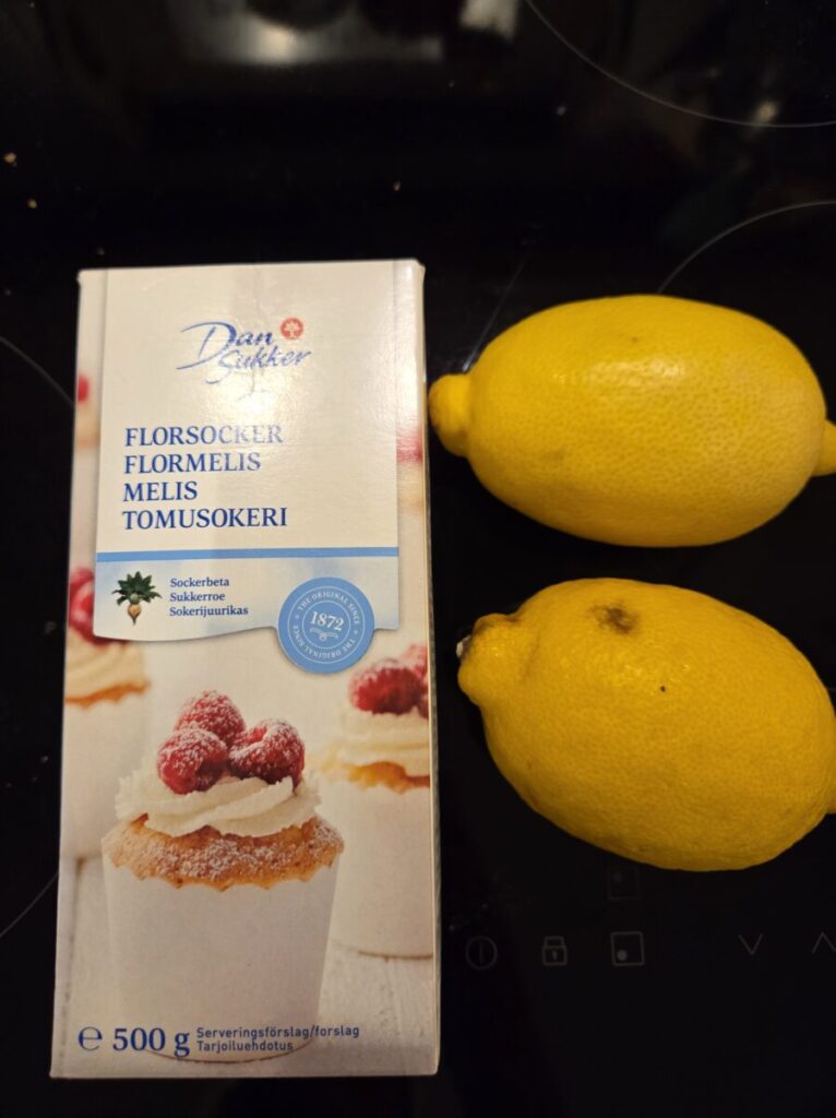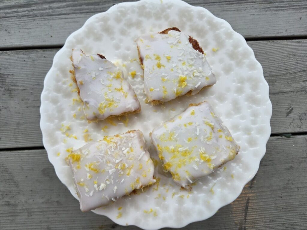 Jeg elsker smaken av kokos og sitron og har brukt saften av 1 1/2 sitron i melisglasuren. Liker du ikke sitron så pynt feks med bare vanlig melisglasur, kokos og feks strøssel, sjokolade, hakkede valnøtter eller tørket bringæbær. Valget er ditt. 🙂