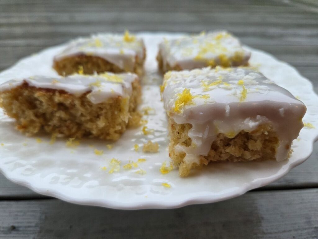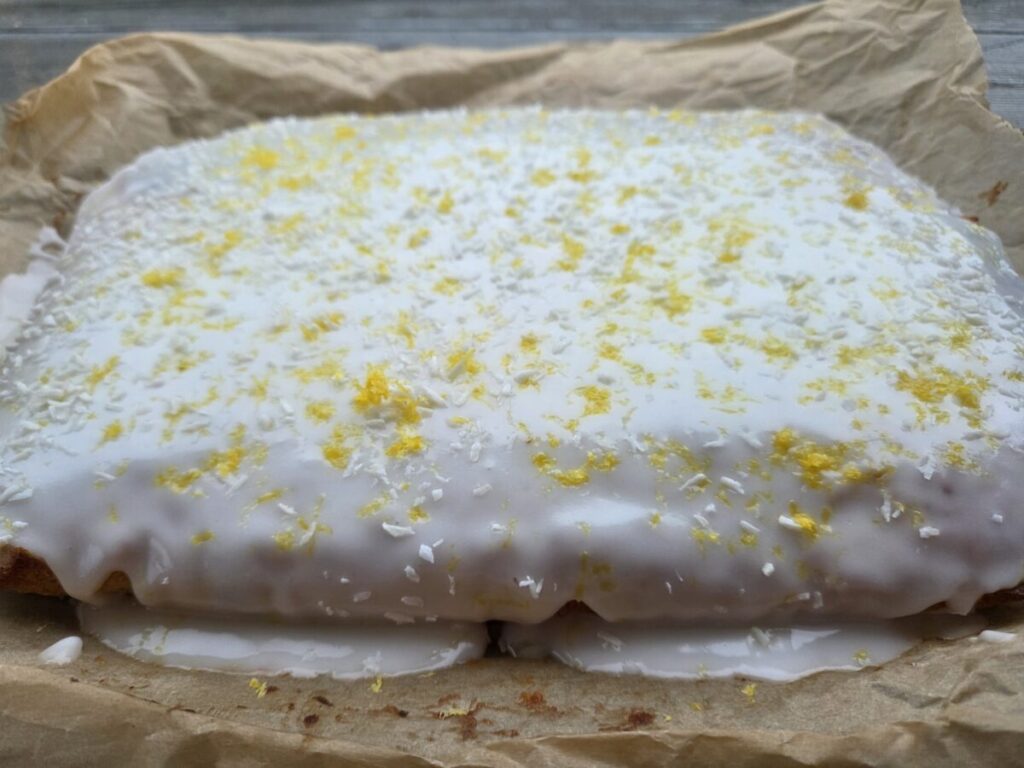 Når kaken er avkjølt blander du melis og sitronsaft sammen til en tykk røre og smører på kaken. Dryss gjerne over kokos og revet skall fra sitronen. Eller bruk det du liker og ønsker.