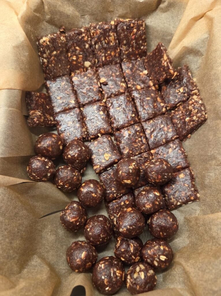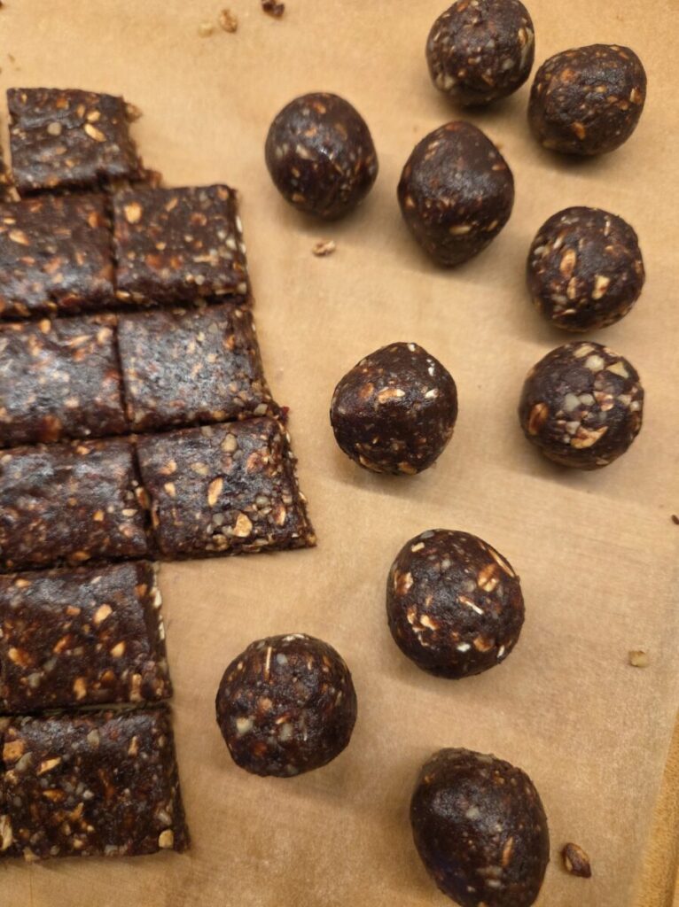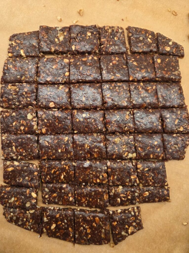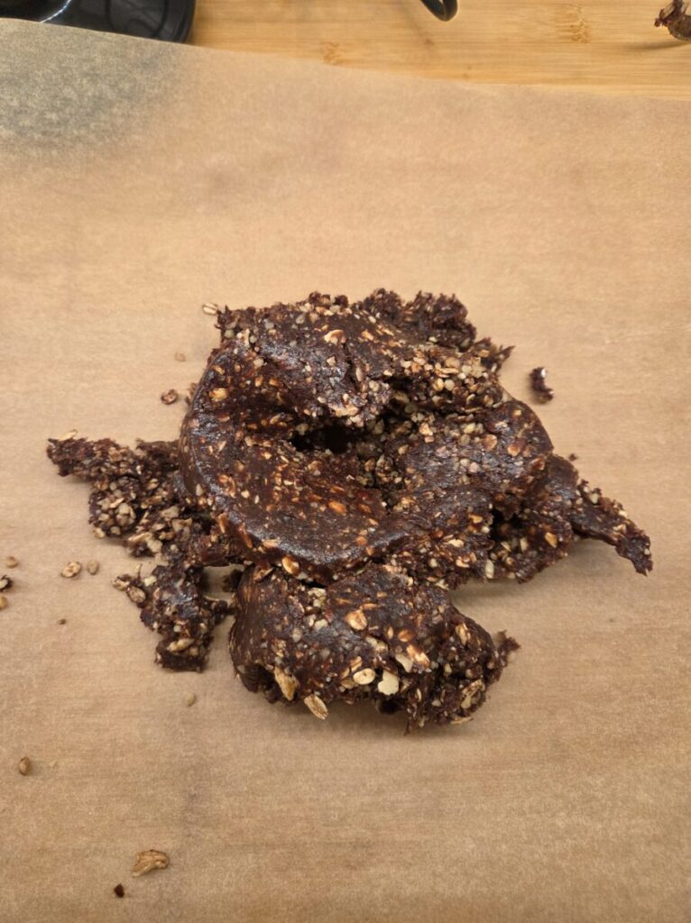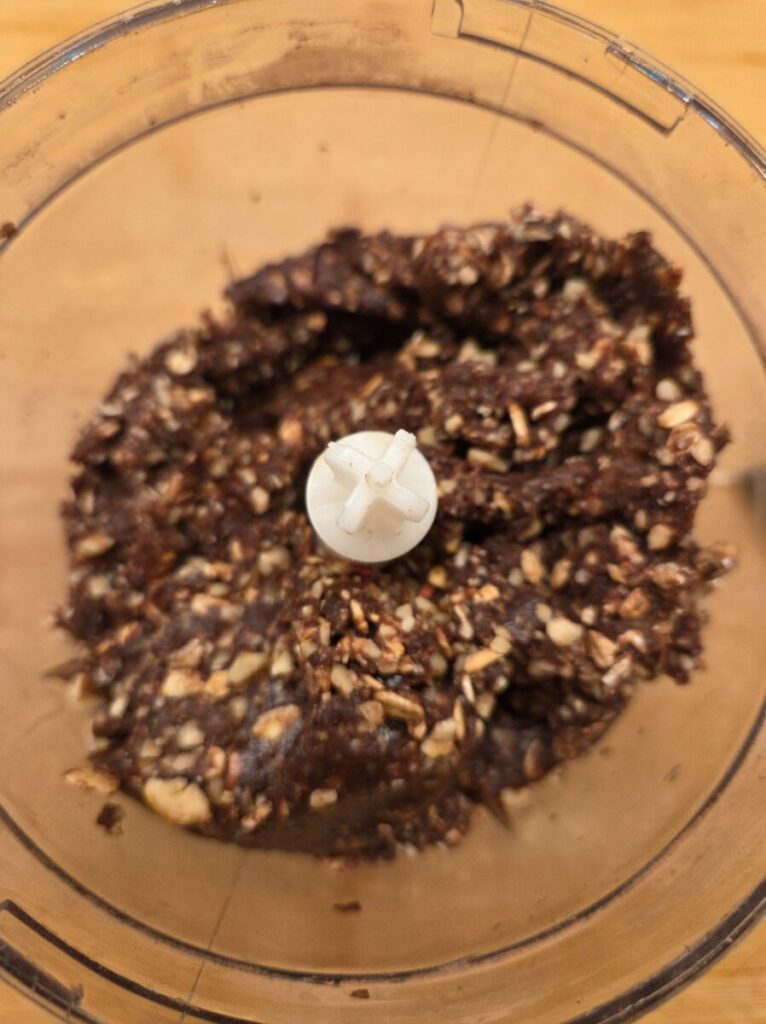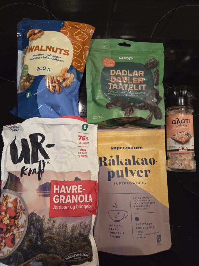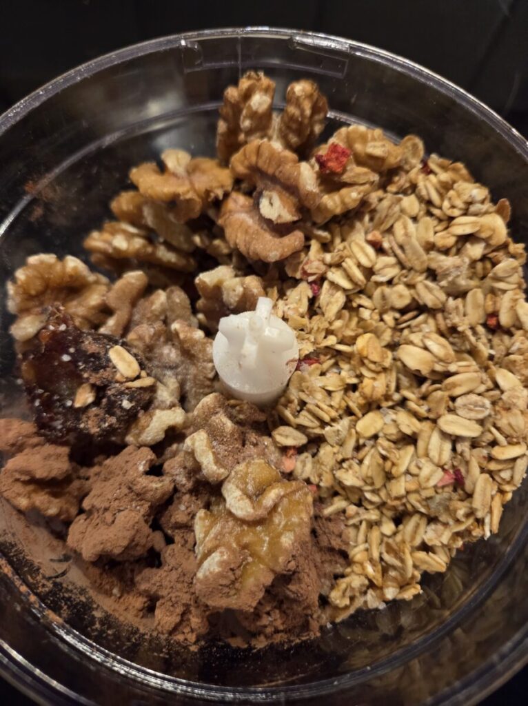 Jeg putter havregranola/havregryn i en blender sammen med dadler, salt, valnøtter og råkakao. Kjør til det blir en seig masse.