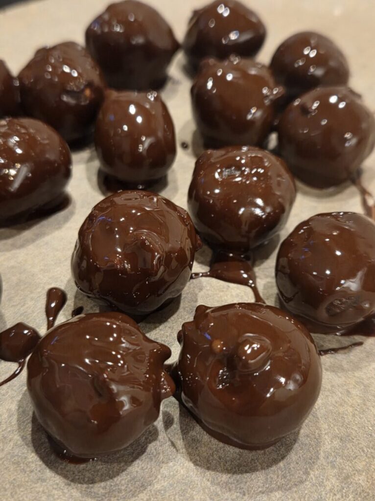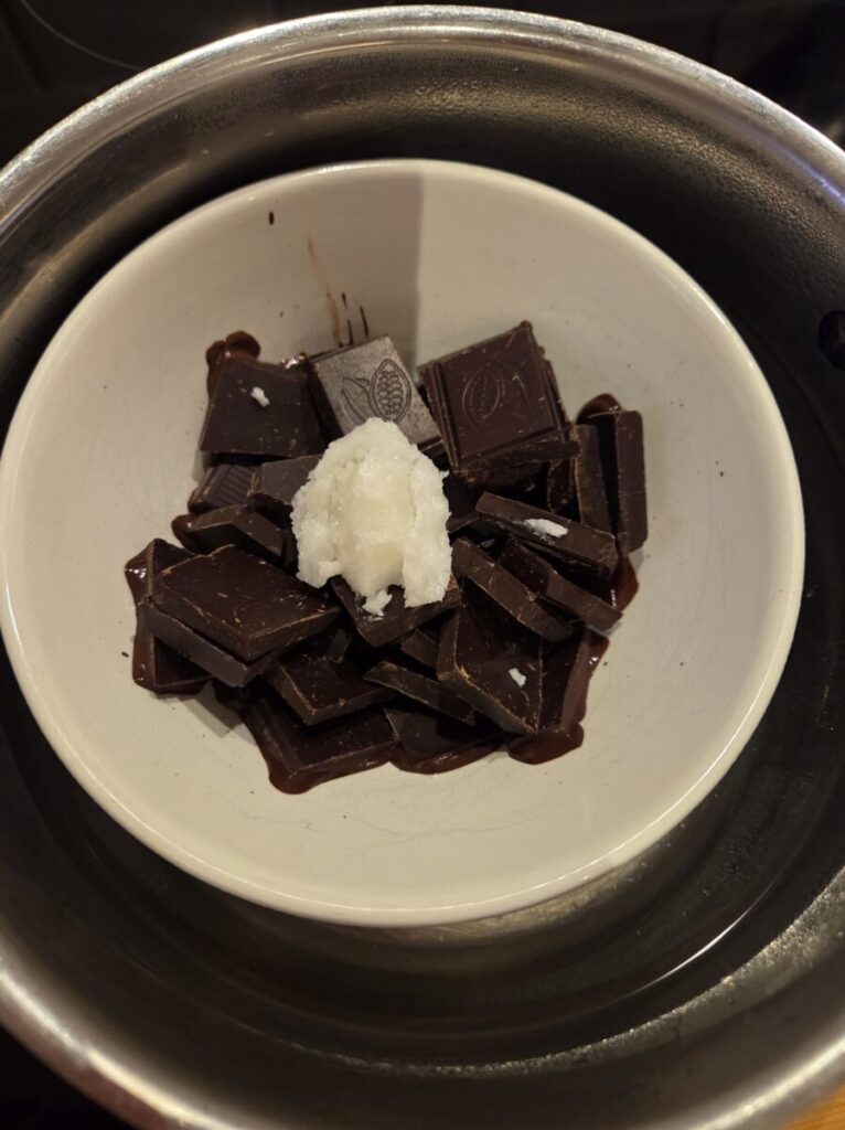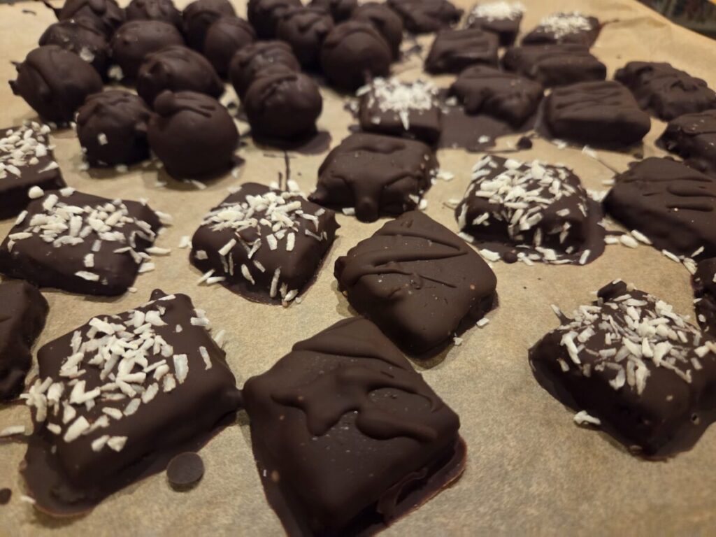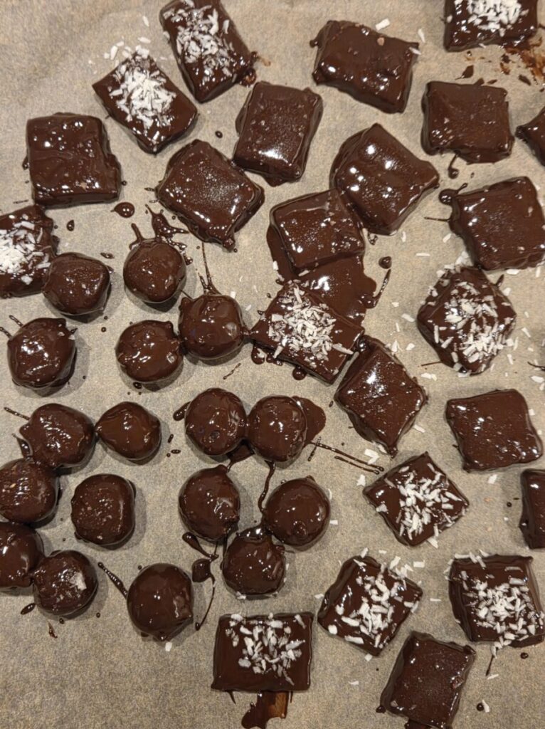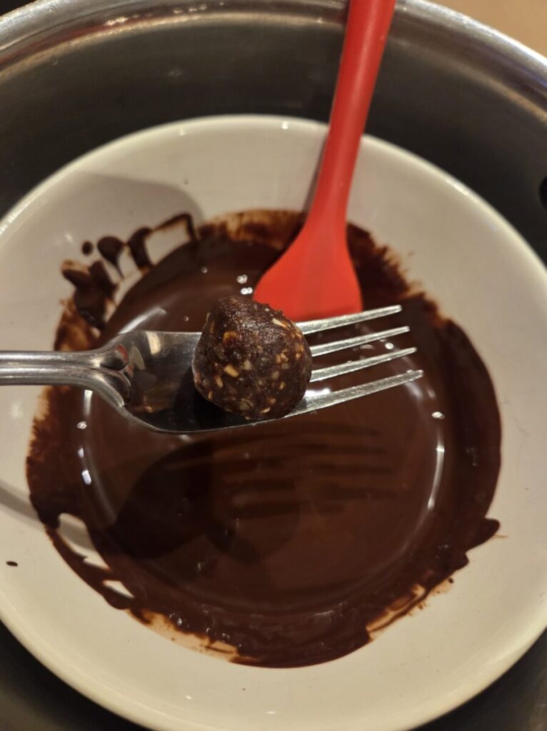 Smelt sjokolade og kokosolje i en bolle som står i en kjele med kokende vann. Dypp bitene/kulene i sjokoladen og sett på bakepapiret. Dryss gjerne over kokos el nøtter eller kakao hvis du ønsker. Jeg synes det er godt med bittelitt himalayasalt på. Smak og behag. 😉