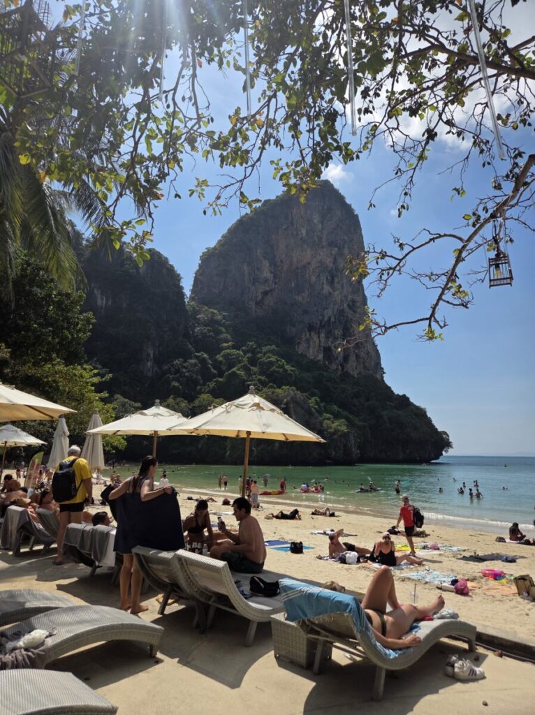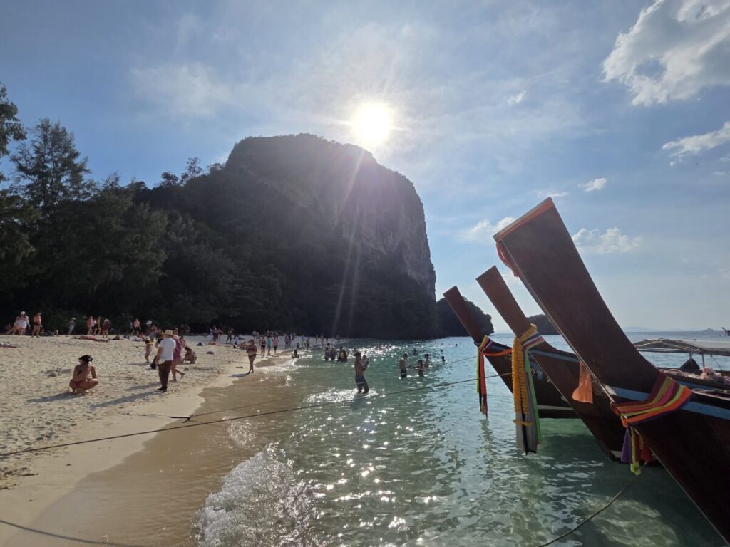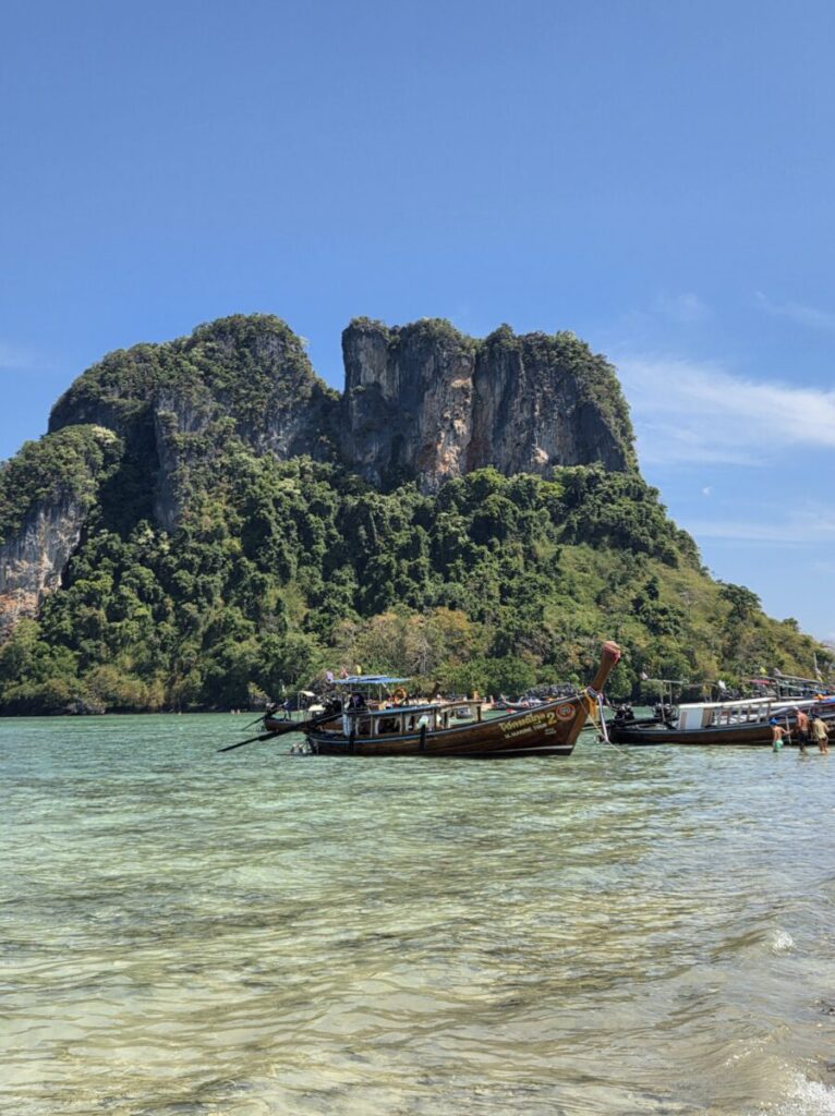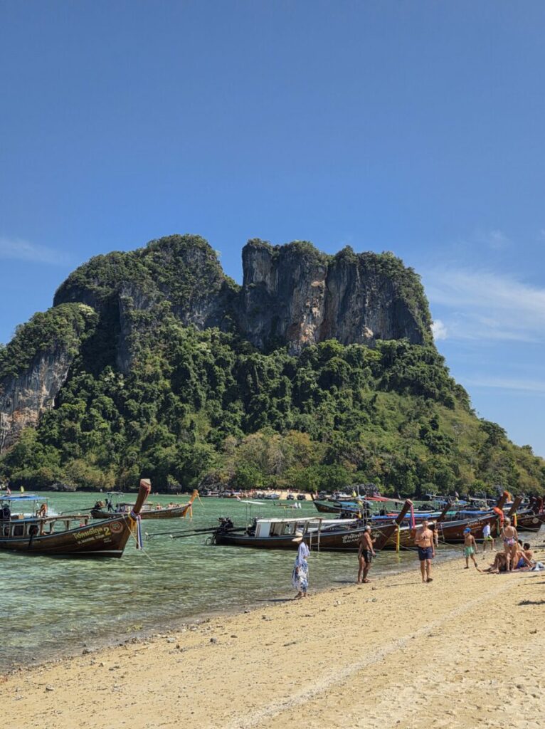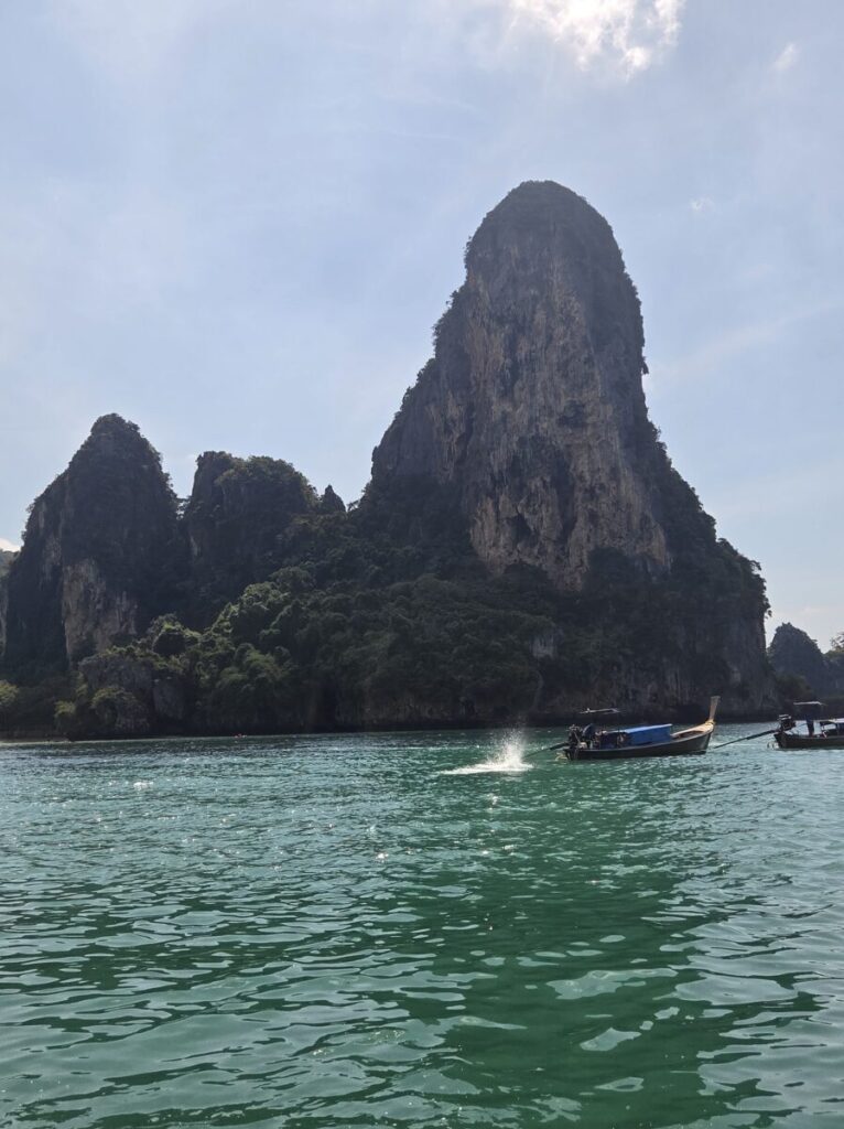 Første dag dro vi med longtail båt til verdenskjente Railay beach. Det var en kjempefin båttur med fantastiske naturopplevelser. Høyreiste og vakre fjell sto opp av havet overalt. Vi var helt i ekstase. Og når vi ankom Railey beach var det enda vakrere med spektakulære fjell og en utrolig flott hvit strand.