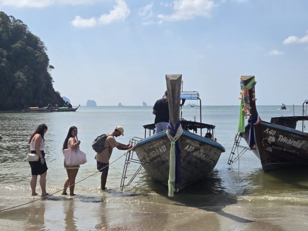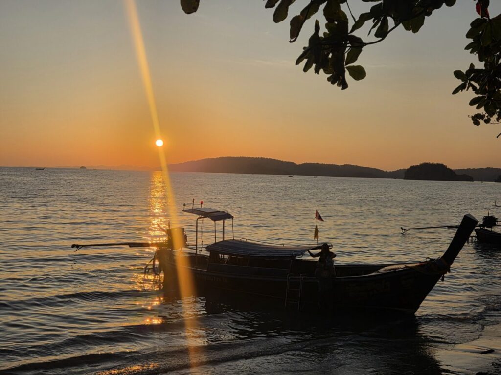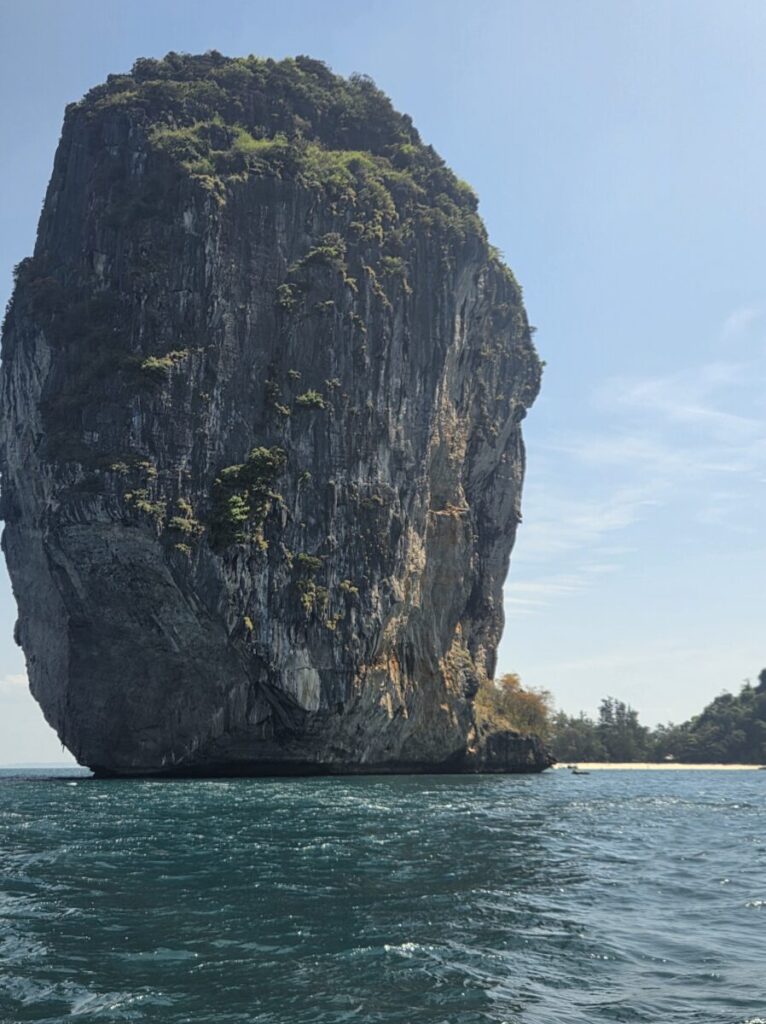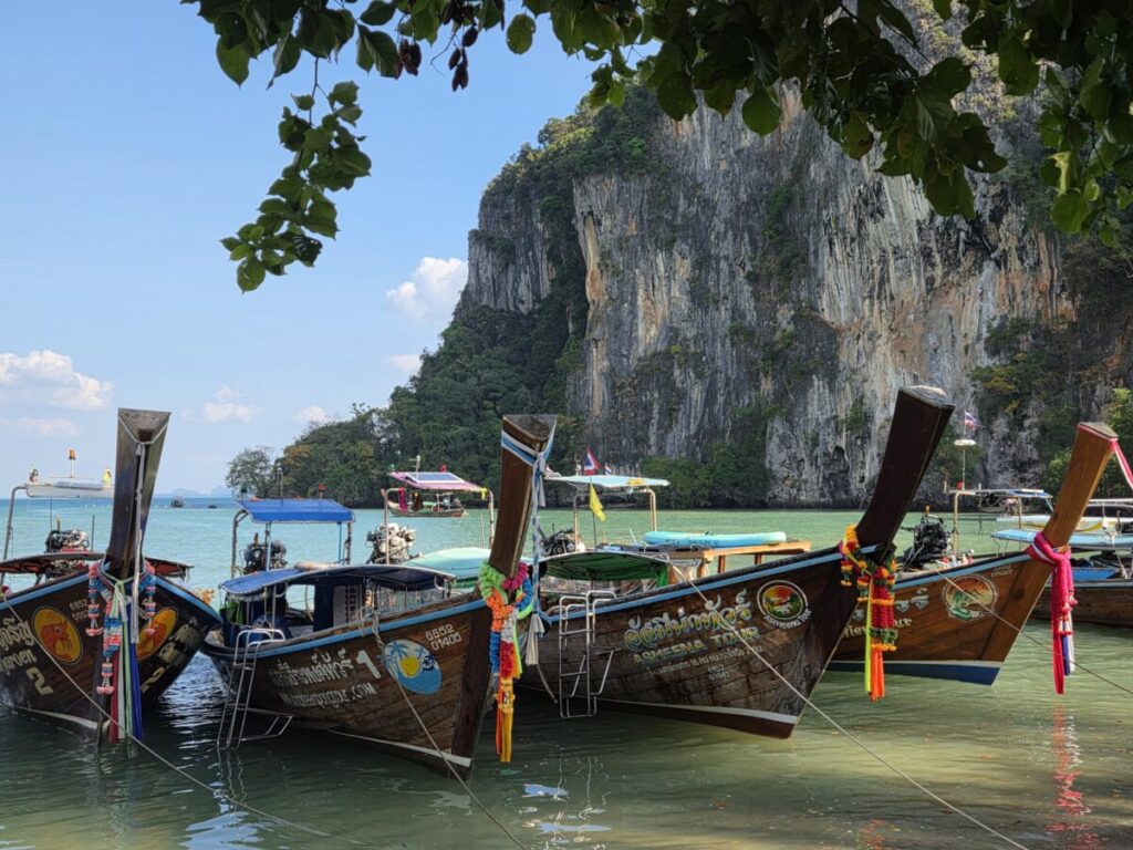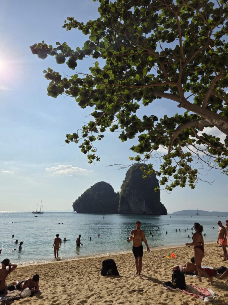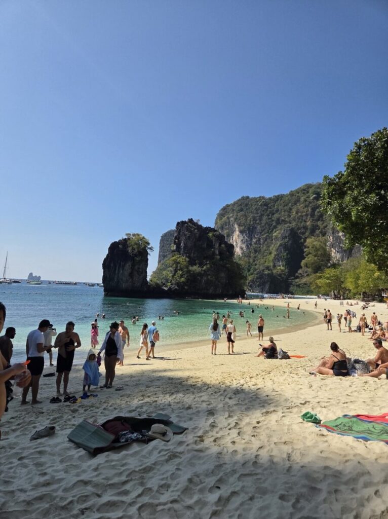 Første dag dro vi med longtail båt til verdenskjente Railay beach. Det var en kjempefin båttur med fantastiske naturopplevelser. Høyreiste og vakre fjell sto opp av havet overalt. Vi var helt i ekstase. Og når vi ankom Railey beach var det enda vakrere med spektakulære fjell og en utrolig flott hvit strand.