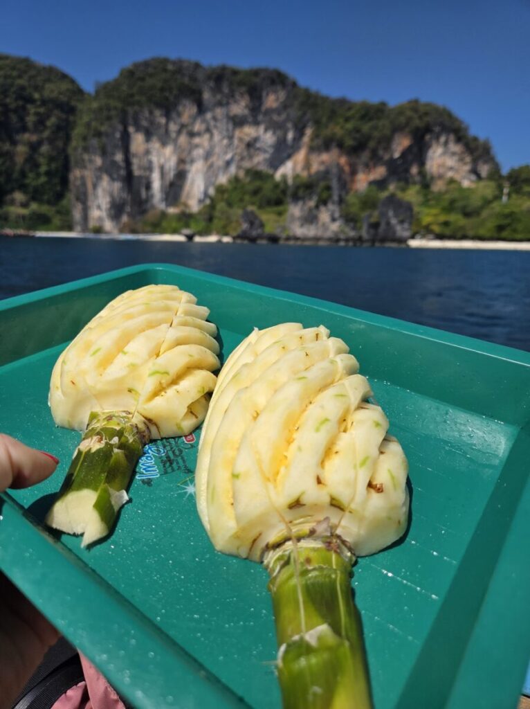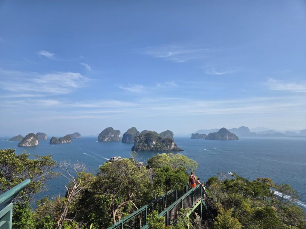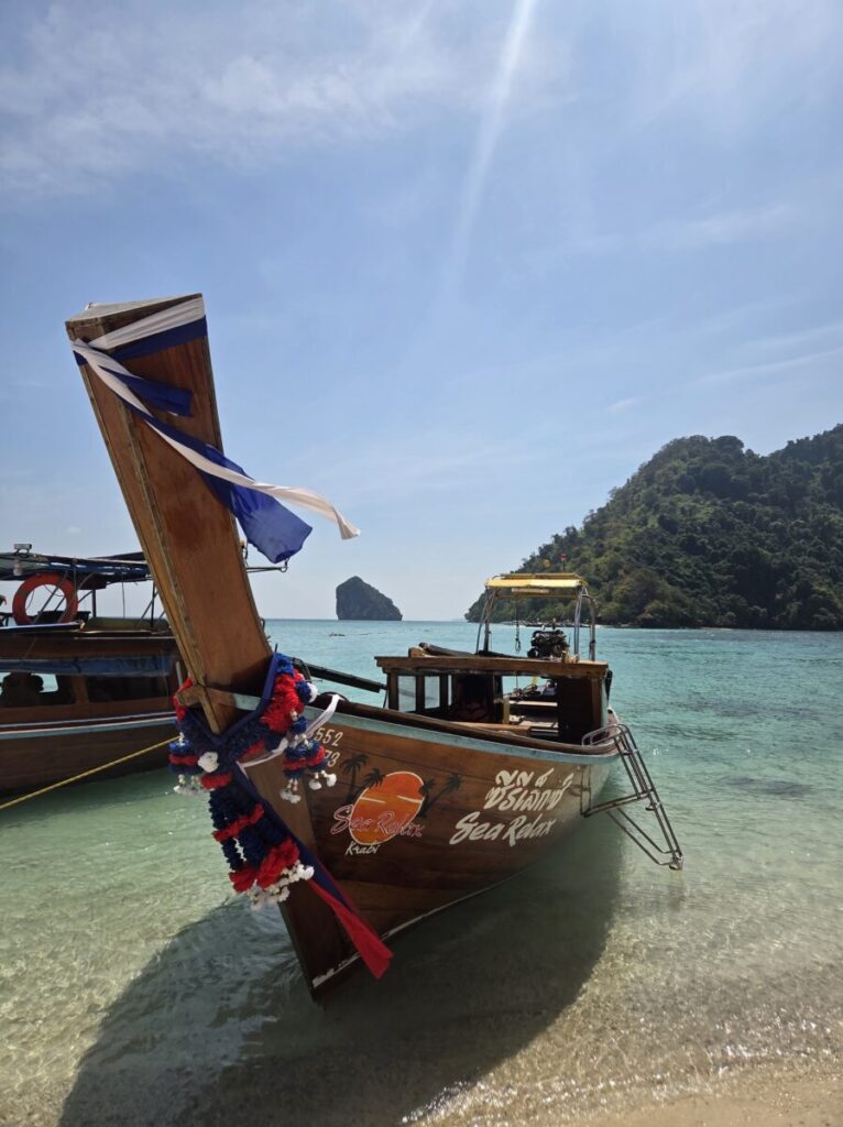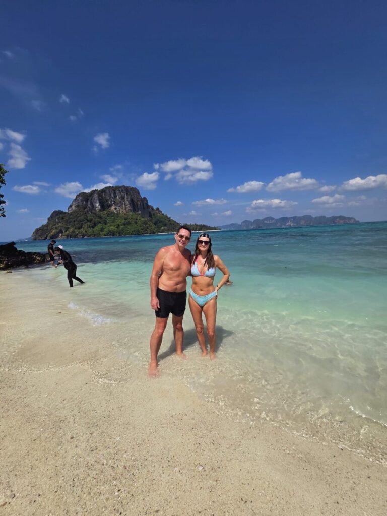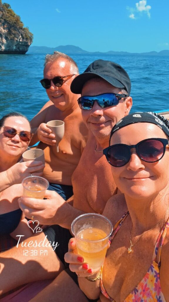 Vi brukte longtail båter ut til flere øyer de neste dagene. Vi leide også en privatbåt som bare vi 4 i reisefølge hadde alene. Da koset vi oss med cava og deilig frukt som kapteinen ordnet til oss. Turen gikk til Hong Island, Kho Hong som de sier, og 3 andre små øyer utenfor. Alle stedene var ubeskrivelig vakre med nydelige strender og natur. På Hong gikk vi trappene opp til toppen hvor det var 360 grader utsikt. Varmt og slitsomt opp trappene men absolutt verdt det når vi ankom toppen. WOW for en utsikt! Fikk vite at Hong betyr Pool, altså basseng på Thai. Og det var nesten som å bade i et basseng på stranden der. 🙂