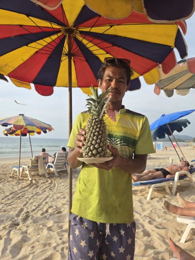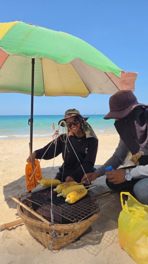 På stranden kom strandselgere med alt mulig av klær, klokker, smykker osv..og de hadde vandrende selgere med varme griller. 🙂 Her grillet de mais og det var veldig godt. Kostet bare noen få kroner. Blide var de også og de kom tilbake neste dag hvis du kjøpte av de. 🙂
