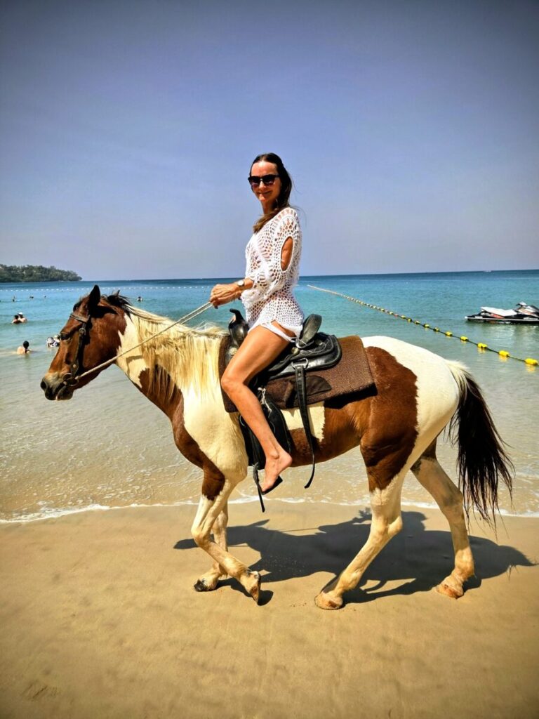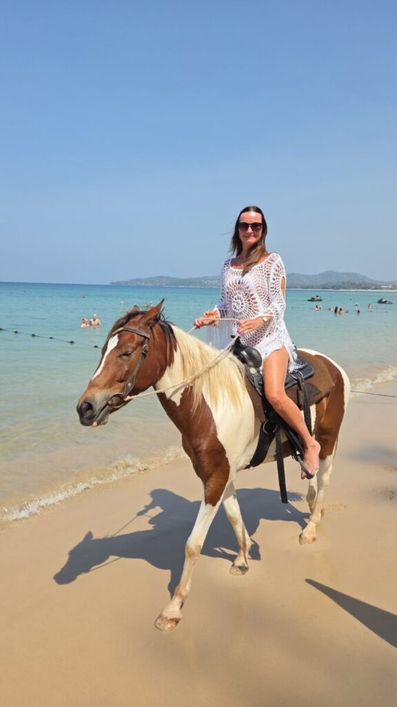 Og det siste minnerike jeg fikk oppleve i Thailand var å ri på hest! 🙂 Dette har vært en drøm jeg har hatt i mange år og endelig fikk jeg den oppfylt. Det var helt magisk og ri ut på den hvite stranden og ut i vannet. Jeg ble helt euforisk etterpå. 🙂 Skikkelig gøy. 🙂 Hesten var snill og god og vi fant tonen.