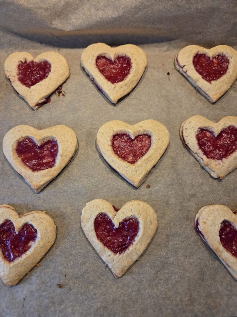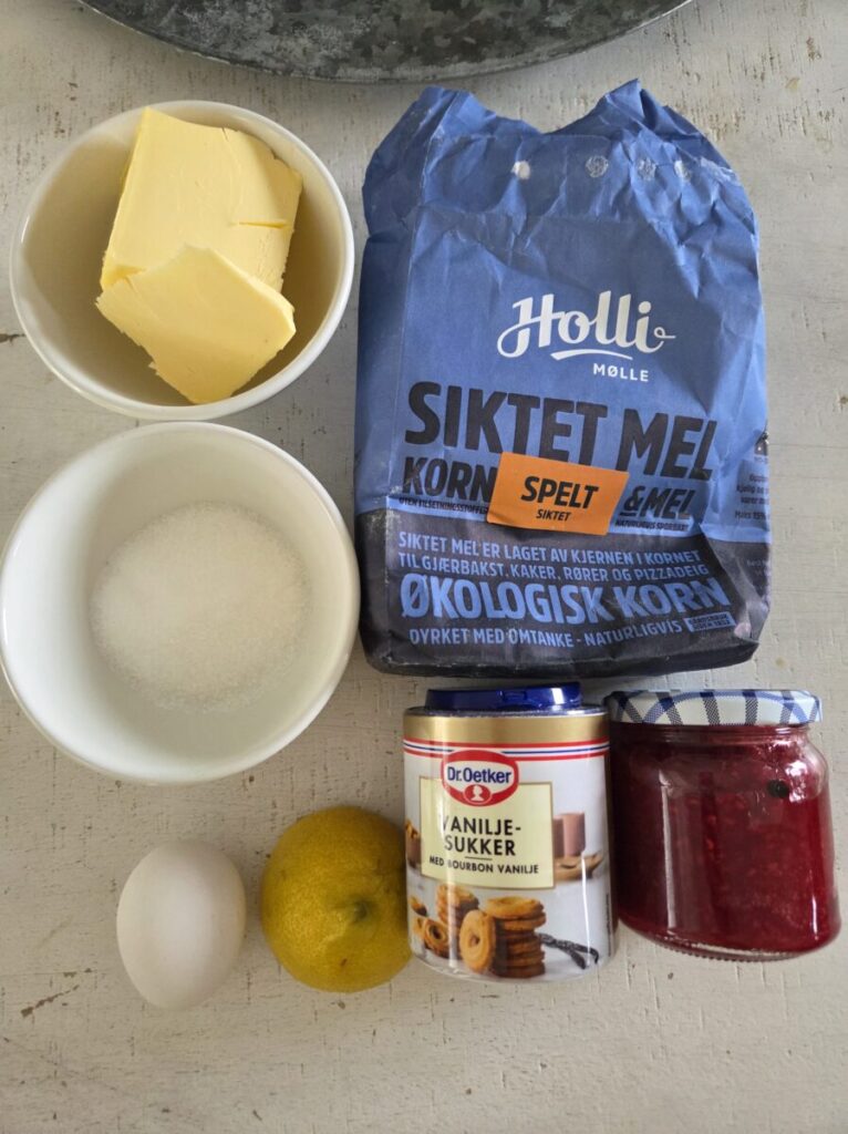Jeg brukte bringbærsyltetøy i de, bruk det syltetøyet du liker og har. Jeg brukte en pepperkake form til å stikke de ut. Når de er ferdige kan du legge de i en tett boks så holder de seg bedre.
