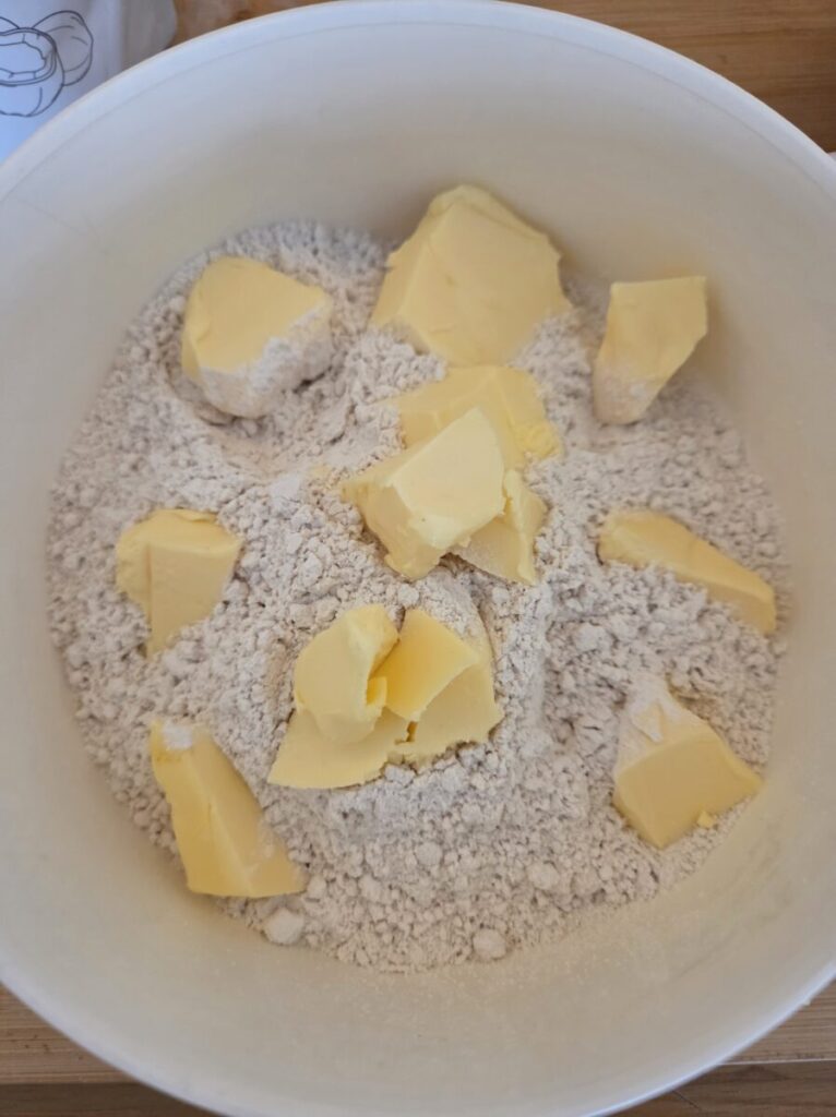 Start med å smuldre smøret i melet, bruk rene hender og smuldre godt sammen.