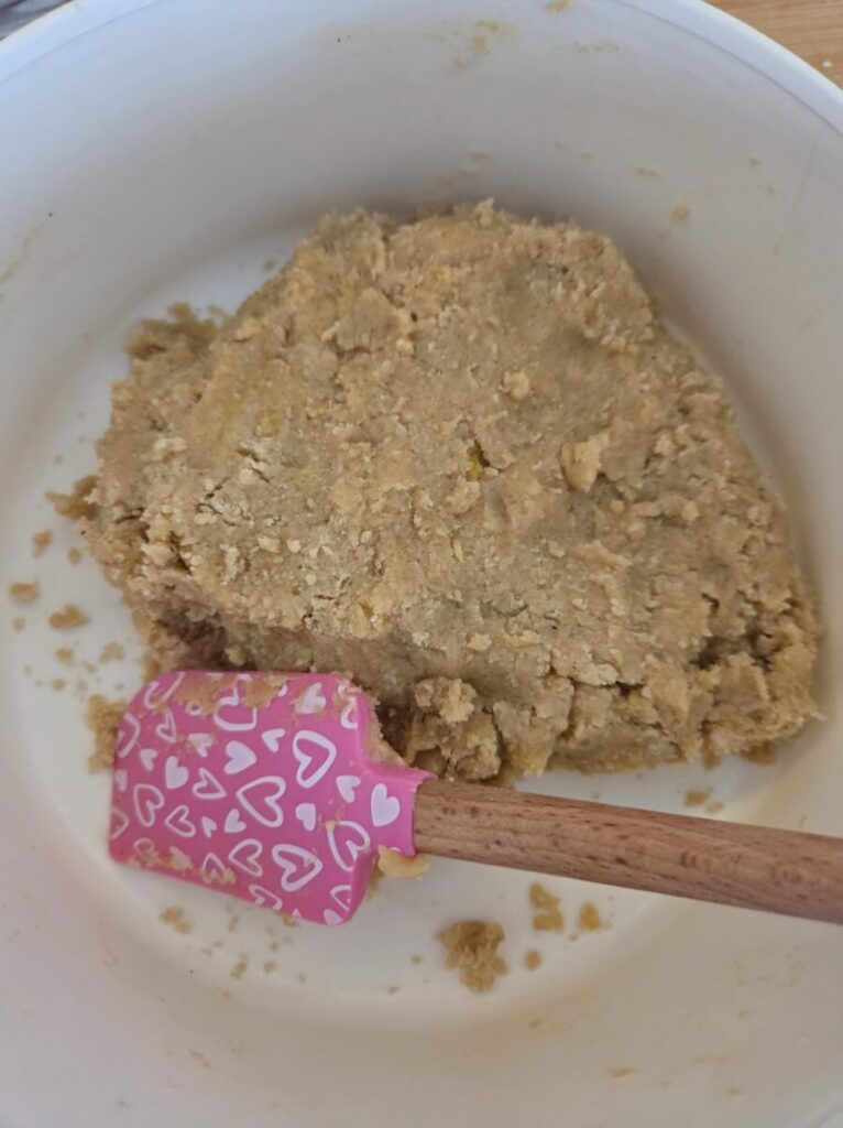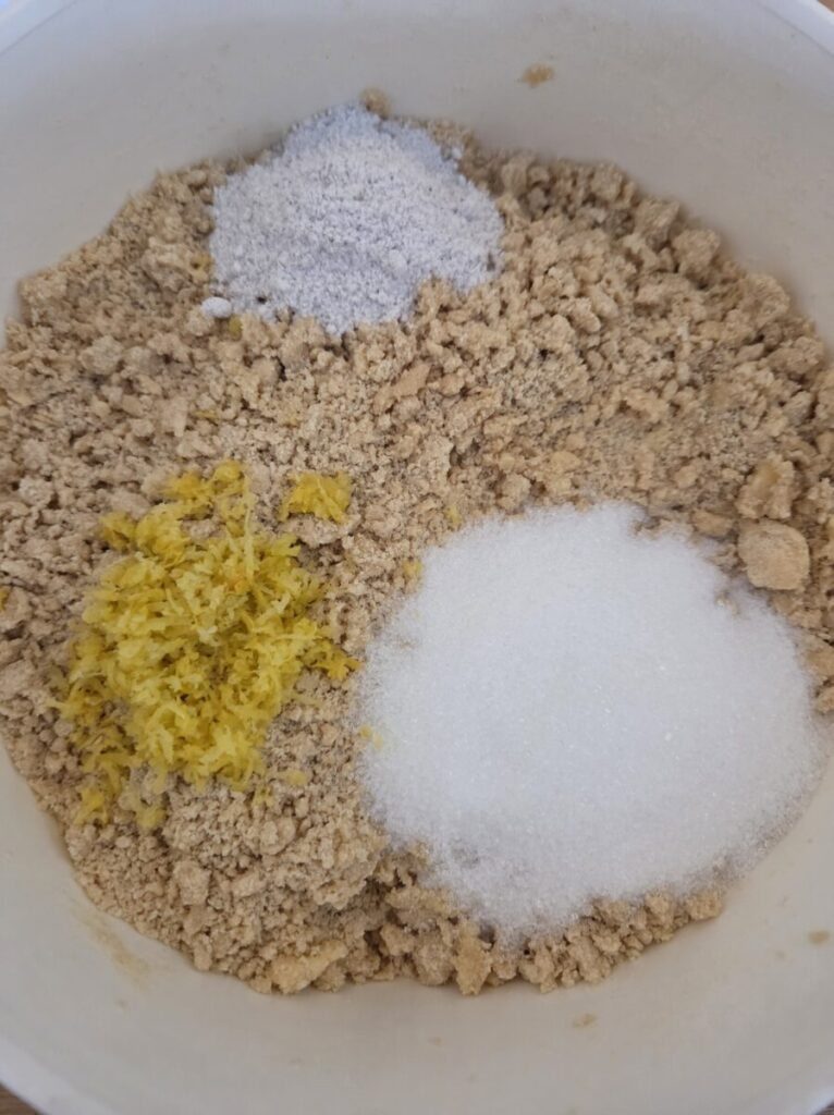 Tilsett sukker, vaniljesukker og revet sitronskall og bland i. Tilslutt tilsetter du egget, her lønner det seg og bruke hendene igjen og kna deigen godt sammen.