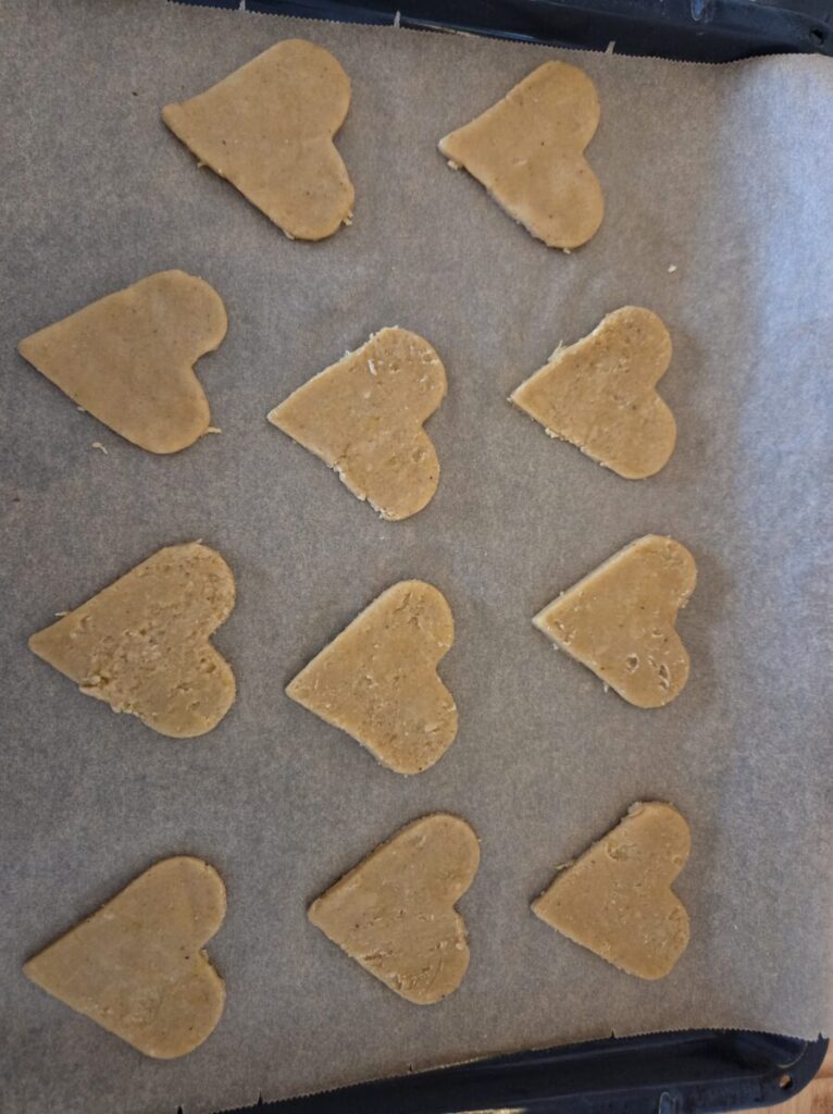 Når du har kjevlet den ut til passe tykkelse så stikker du ut hjerter. Halvparten av hjertene skal være hele og resten skal du stikke ut et hjerte i midten, dette blir «lokket» til kjeksen.