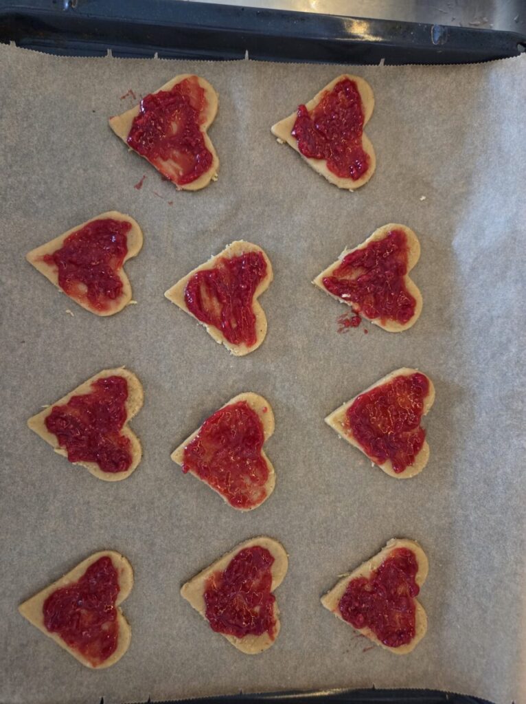 Smør et tynt lag med syltetøy på hjertene og legg på «lokket» ( det hjertet som er stikket ut i midten. )