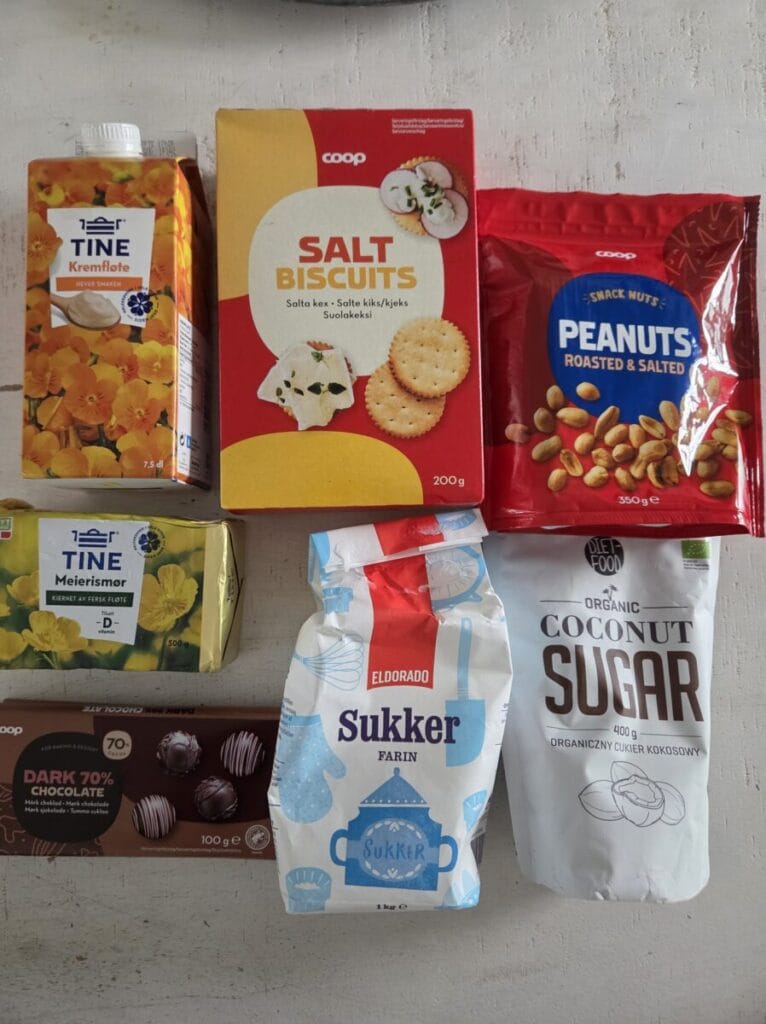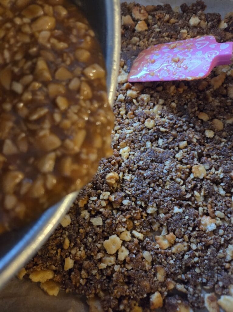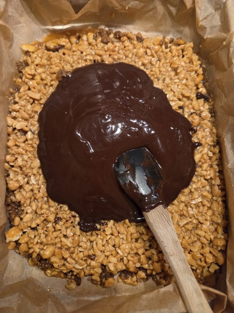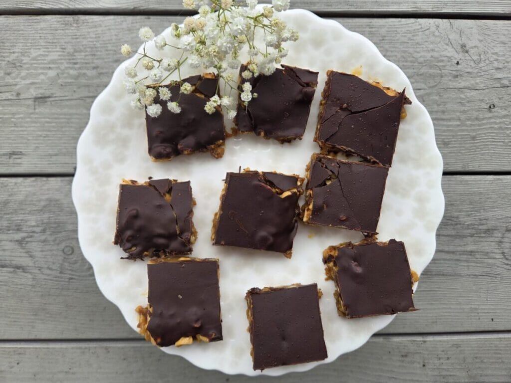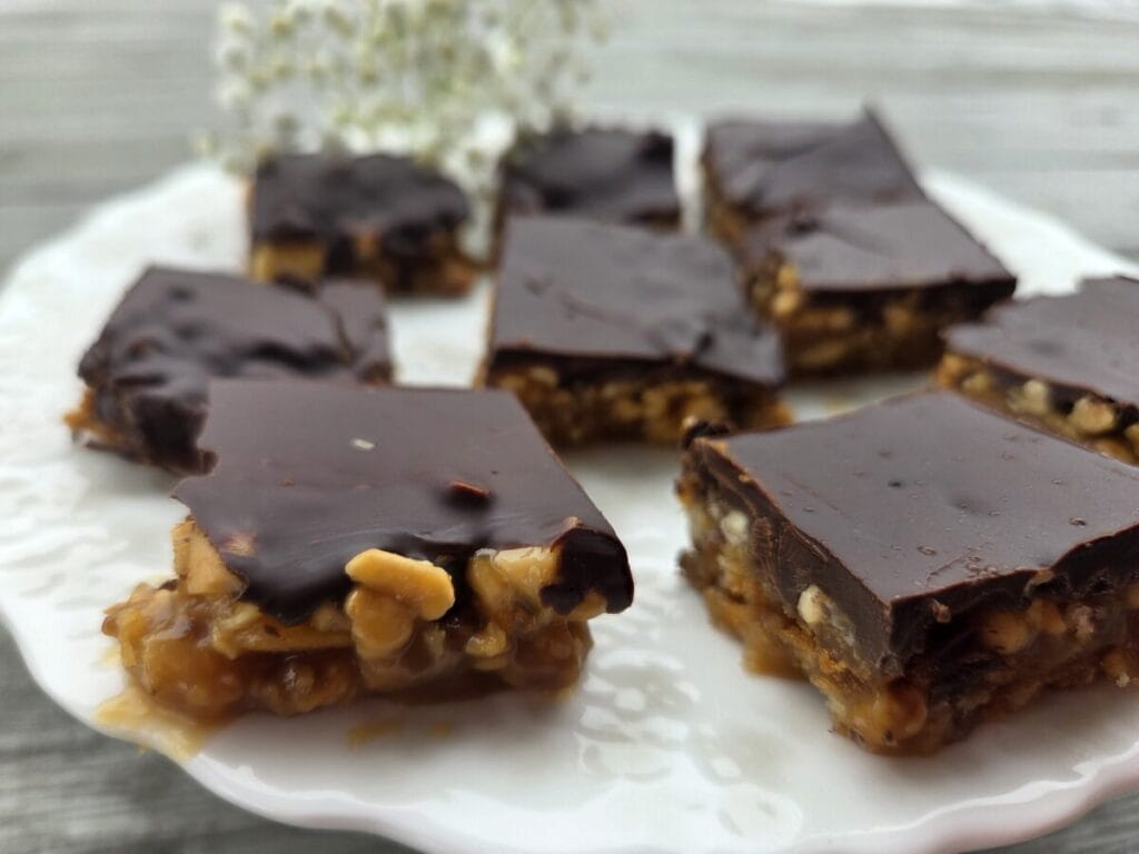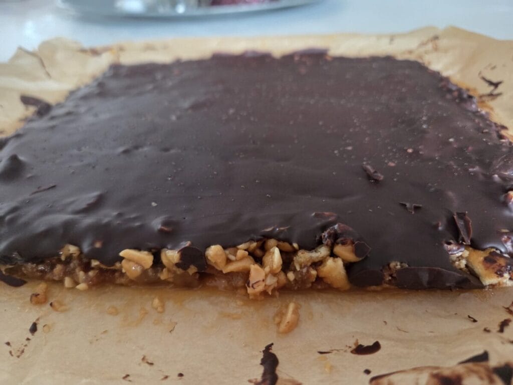 Her er det deilig myk karamell og tykk sjokolade som gjør magiske smaker. Litt salte er de også pga peanøttene og ritz kjeksen men det passer såå godt sammen. 🙂 Jeg liker et ekstra touch med himalayasalt på toppen av sjokoladen, men det er ikke nødvendig.