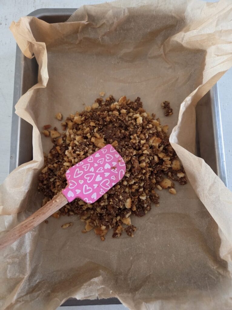 Start med å knuse kjeksen i en pose. Smelt kokos sukker og smør i en kjele på svak varme og ha i den knuste kjeksen. Kle en form med bakepapir og ha kjeksblandingen i. Sett i kjøleskapet så lenge.