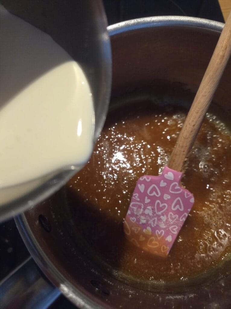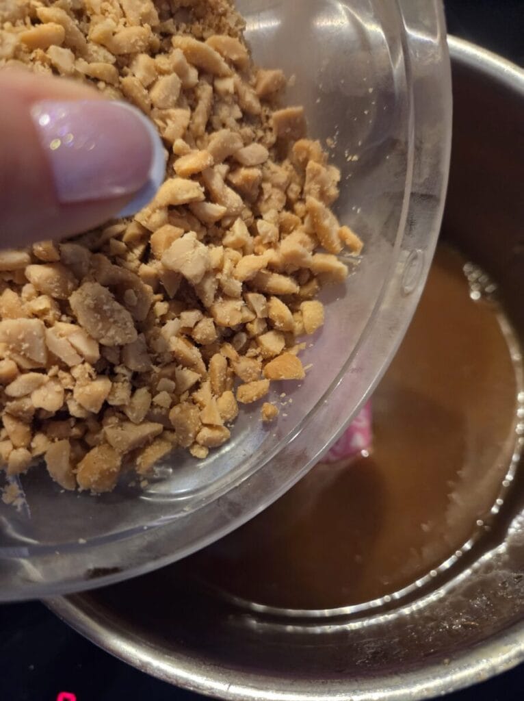 Hakk peanøttene og smelt sukkeret til peanøttkaramellen i en kjele. Tilsett smør og litt og litt av kremfløten. Kok opp og la småkoke litt. (122 grader skal den bli men jeg har ikke måler så småkokte den litt bare) Ta kjelen av palten og tilsett peanøttene.