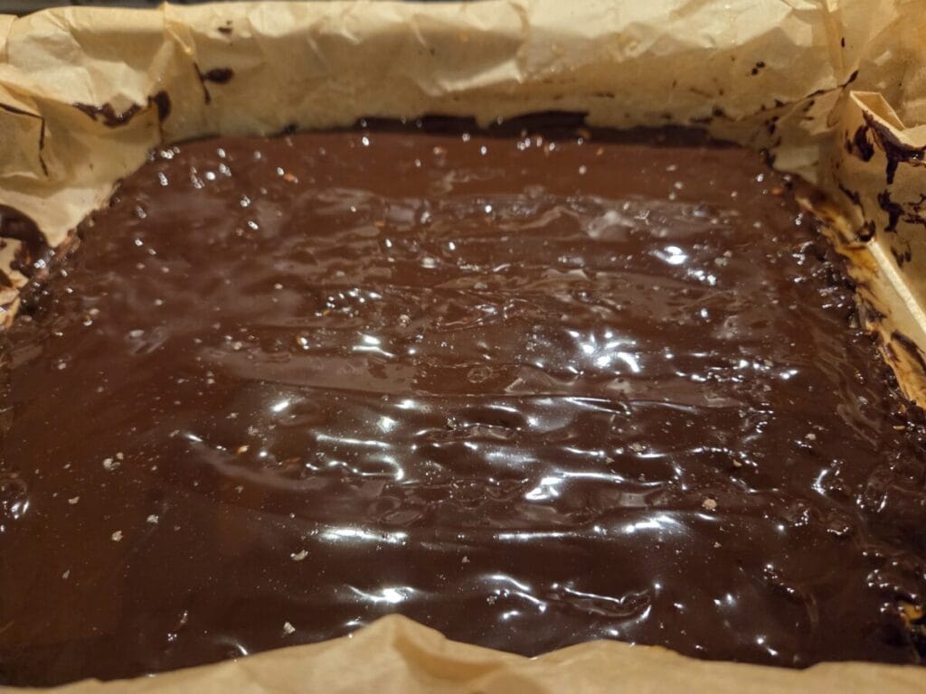 Smelt sjokoladen til toppingen og tilsett smøret, rør til jevn blanding. Hell sjokoladen over kaken, husk at karamellen må være stivnet først. (Tilsett gjerne et dryss av himalayasalt på toppen av sjokoladen eller dryss feks over peanøtter. ) Sett kaldt 1 time og skjær opp i ruter når alt er stivnet.