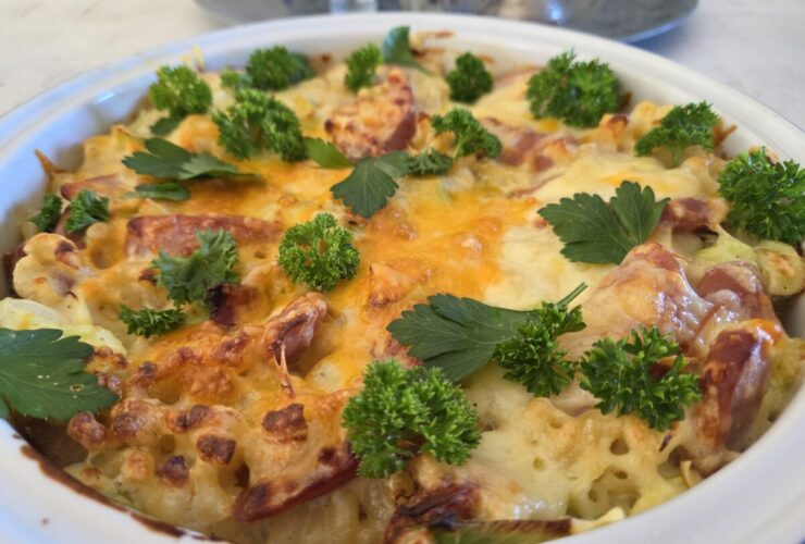 En gratinert makaroniform med hvit ostesaus og pølser er noe alle liker. En god hverdagsmiddag for store og små. 🙂 Her kan du godt putte inn litt grønnsaker, feks squash, paprika, gulrot mm… Jeg puttet i fersk vårløk kun fordi jeg synes det er såå godt i denne formen. Du kan servere feks salat ved siden av hvis du ønsker ...